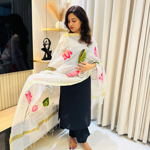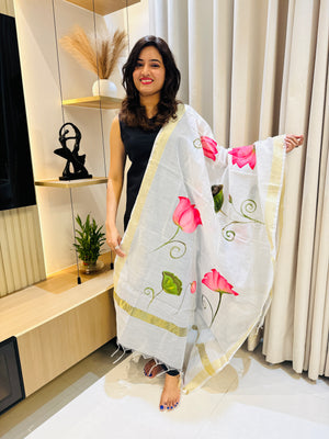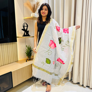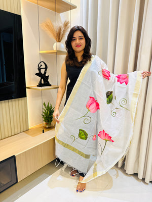 Hand-painted Cotton Silk Dupatta - White with Pink Flowers