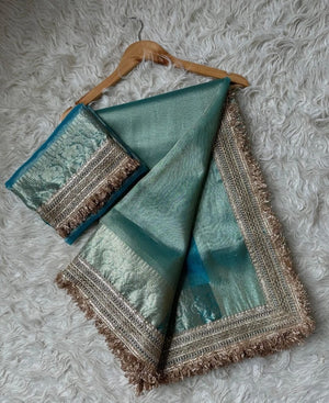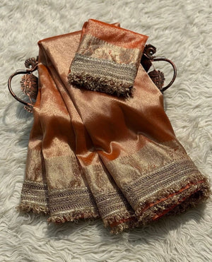 Banarasi Kora Silk Tissue Zari Weaving Saree - Blue, Yellow, Orange, Grey