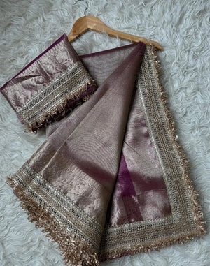 Simply beautiful, a check style kora tissue silk banarasi saree with golden zari weaving. Wrap Yourself In Elegance With Banarasi Tissue Silk with Zari Border. Crafted With Exquisite Craftsmanship, This Saree Exudes Timeless Charm And Sophistication.