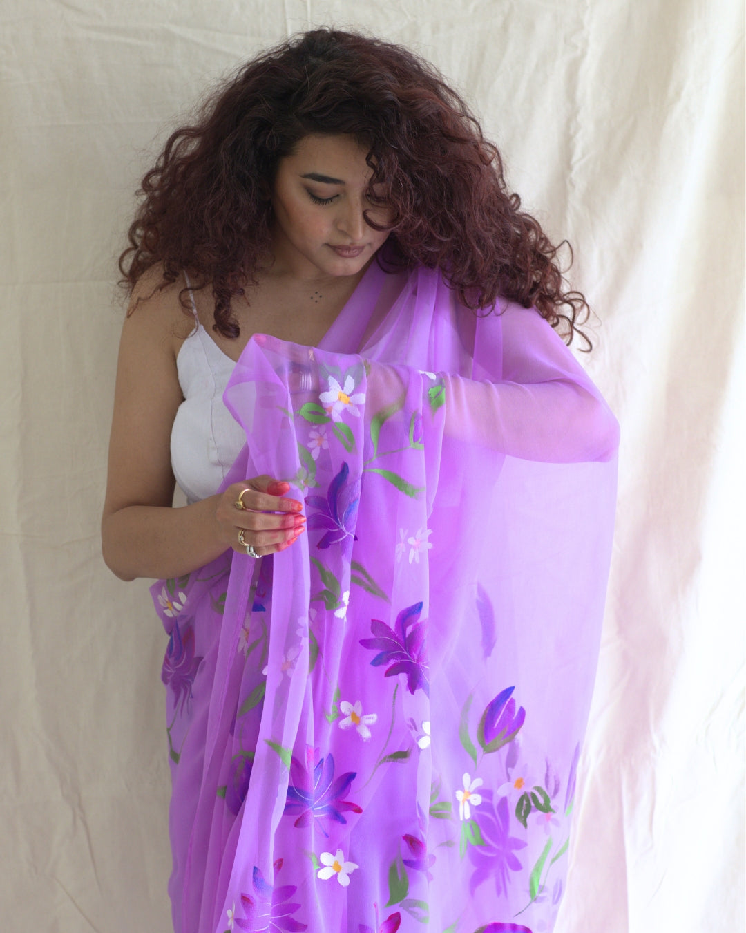 | Fabric | Hand Painted Chiffon Saree |