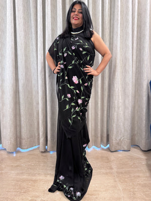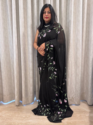 Hand painted Georgette Black Saree - Beautiful Floral Design