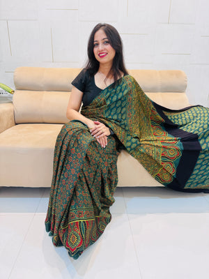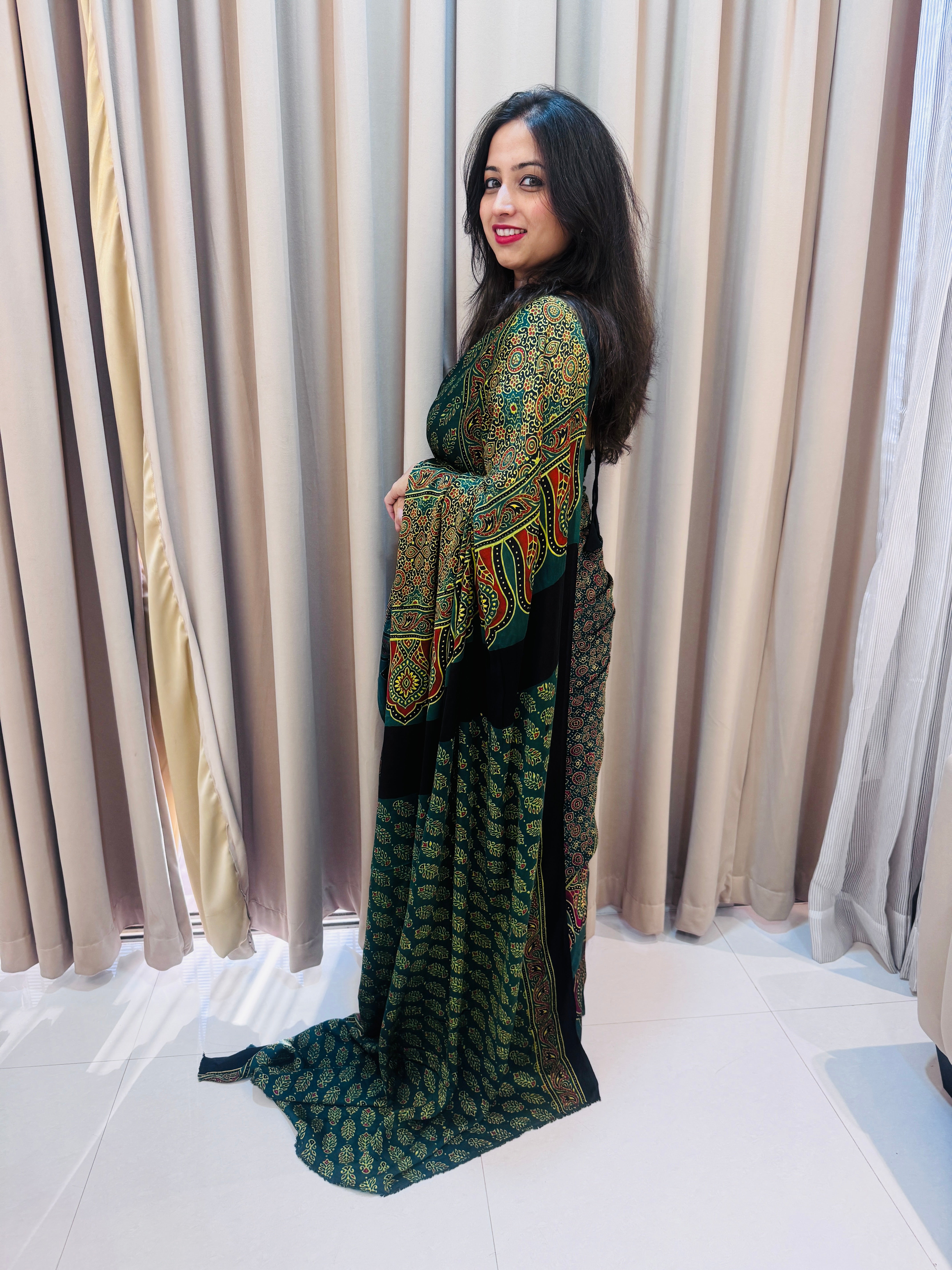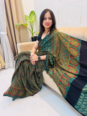 Modal Silk Ajrakh Saree With Natural Dyes- Green