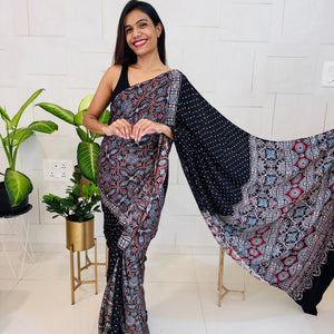 Modal Silk Ajrakh Saree With Natural Dyes - Black With Polka Dots and Ajrakh Hand Block