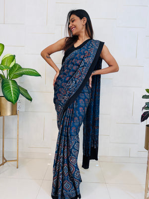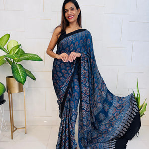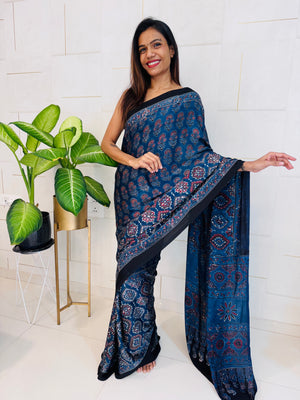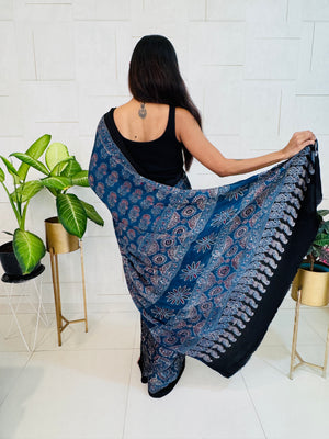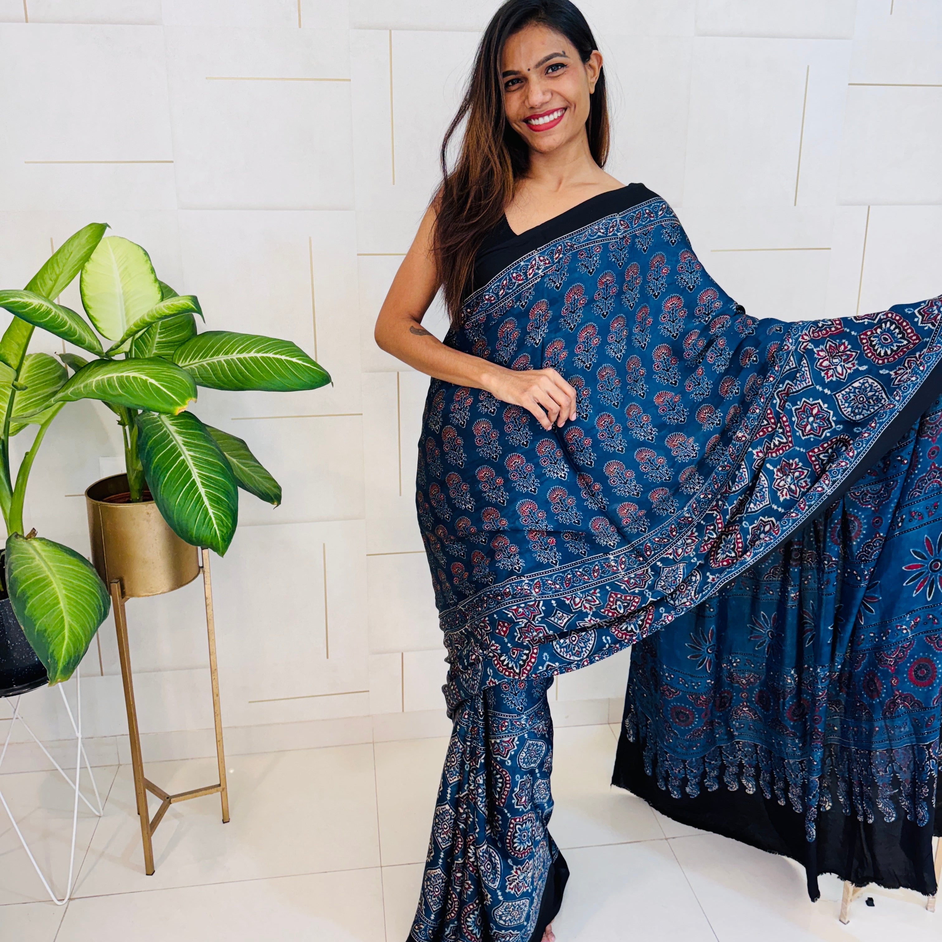 Modal Silk Ajrakh Saree With Natural Dyes - Indigo With Black Hand Blocked Ajrakh