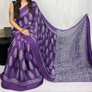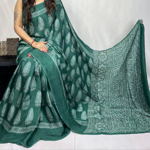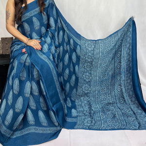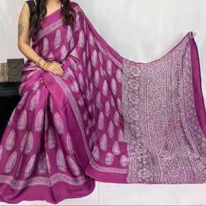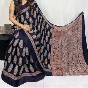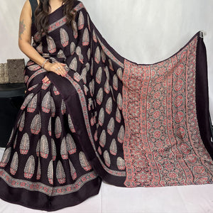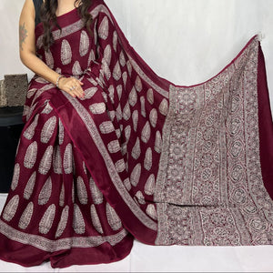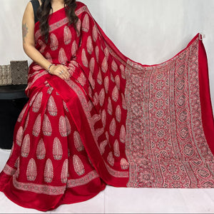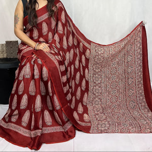 Mashroo Mix Modal Silk Ajrakh Saree- Red, CoffeeBrown, Magenta,Maroon,Indigo and more