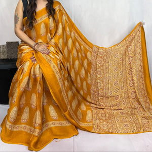 This is a Mashroo mix Modal Silk Ajrakh Saree is ideal for an attractive look. This exquisite Ajrakh has block print pattern all over wit vibrant colours.