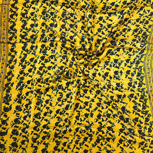 Blessing of Ajrakh on charismatic fusion of Yellow and Black. This Ajrakh modal silk saree is exclusively designed by spreading the animal print buta throughout with floral border running across the length of the saree. Beautifully designed palla is exhibiting the patterns of paisleys and Minkundi Jaal.