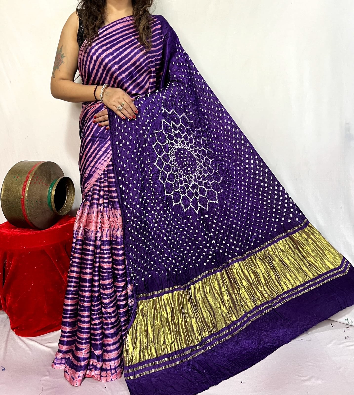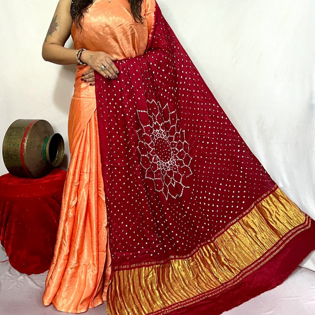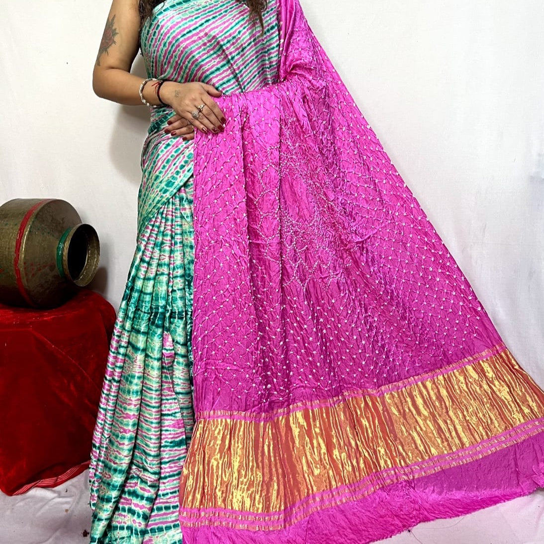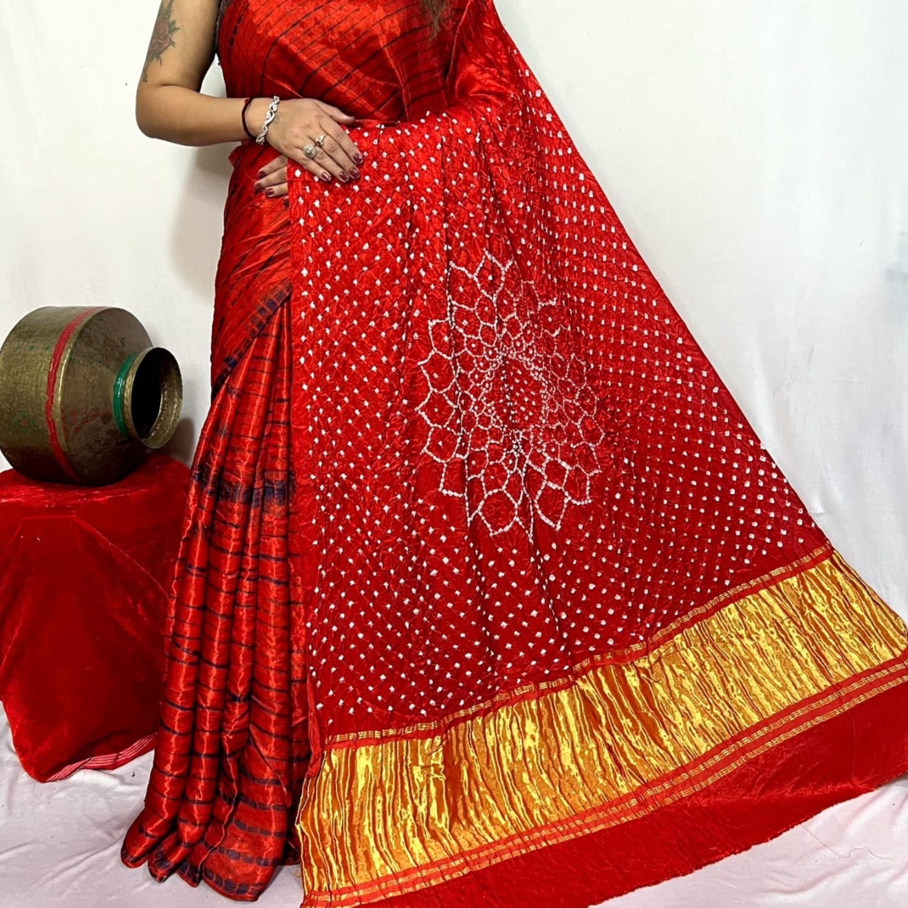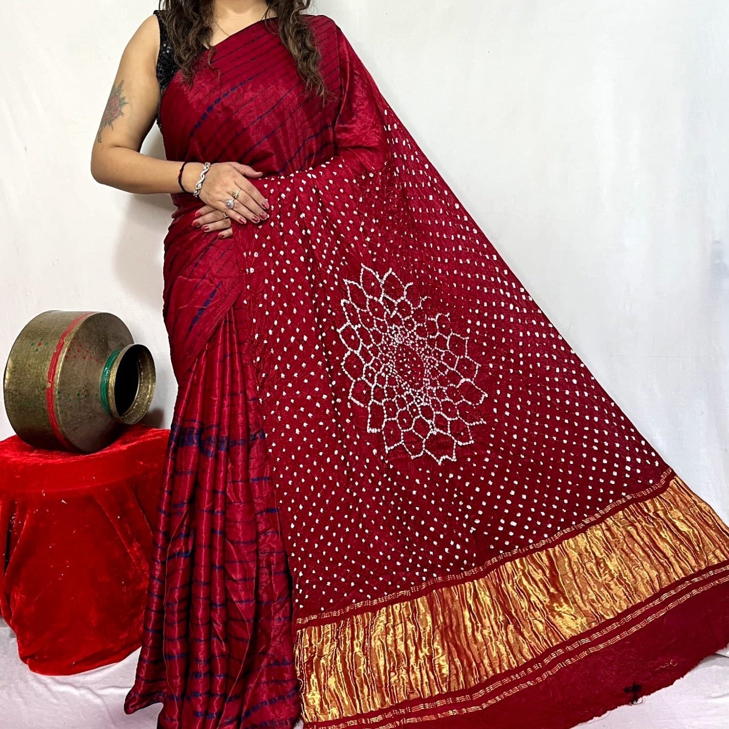 | Fabric | Modal Silk Leheriya Saree, Tie and dye with zari Pallu |