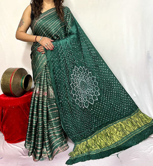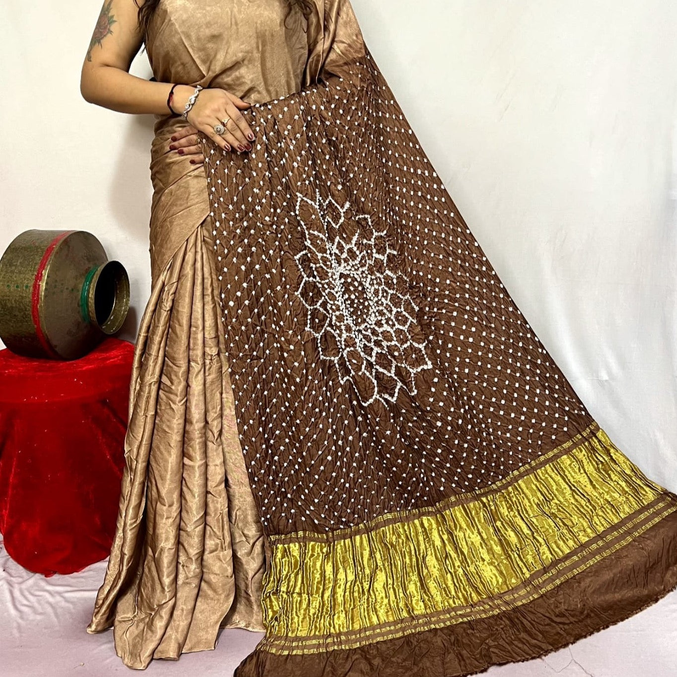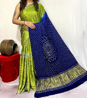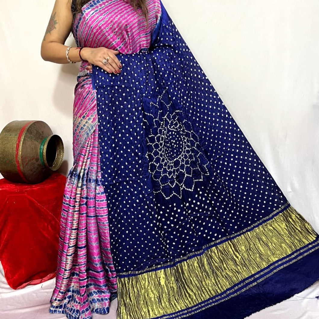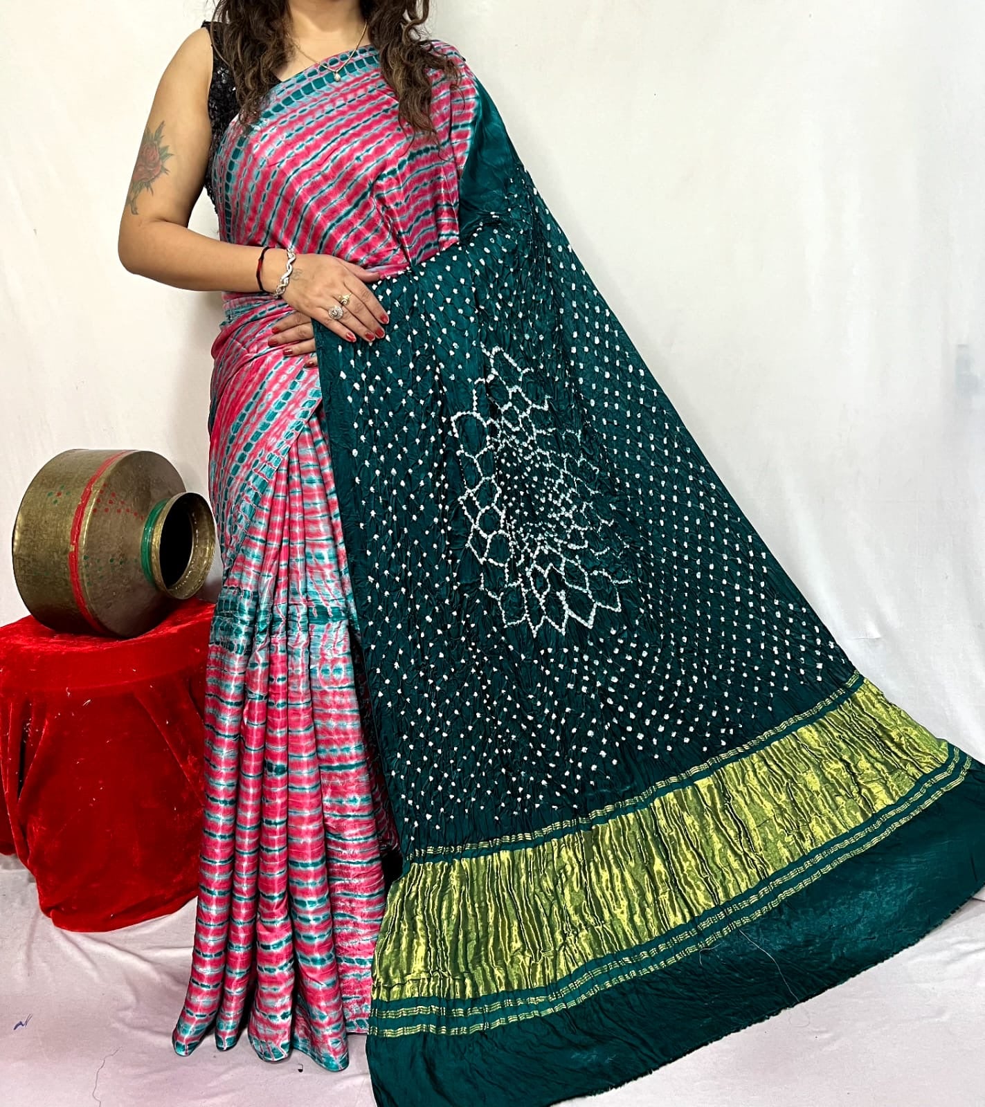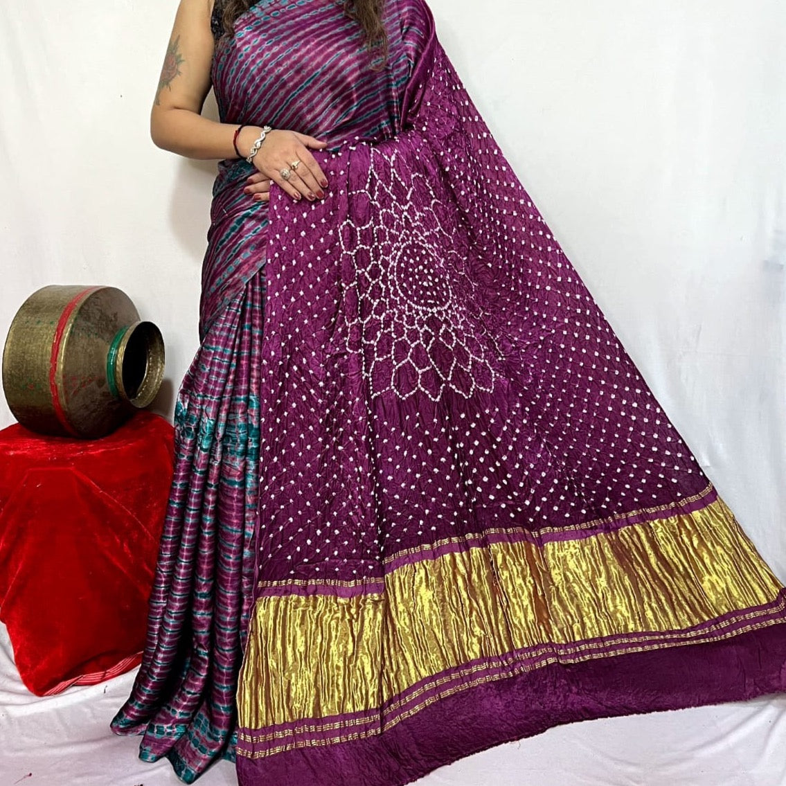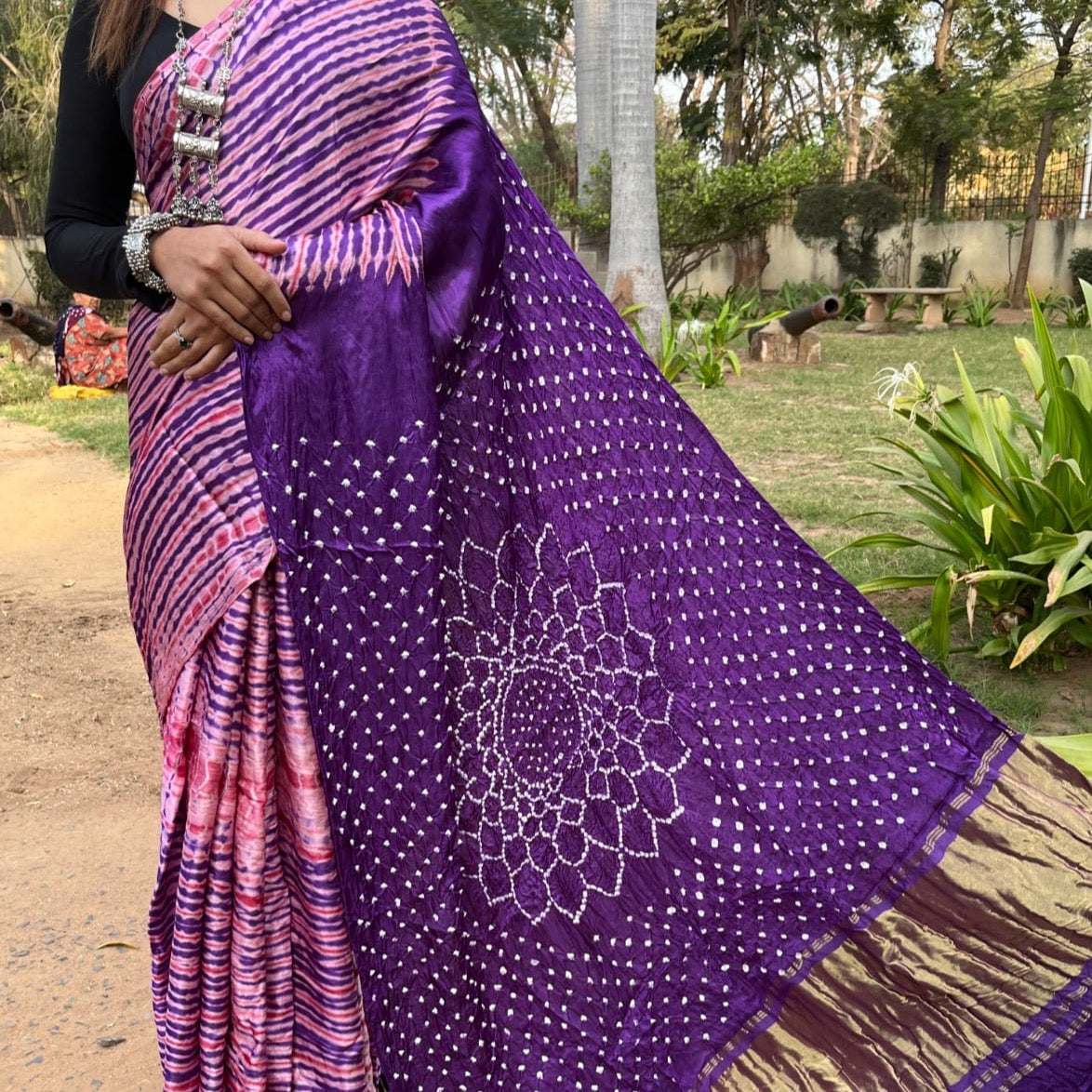 | Fabric | Modal Silk Leheriya Saree, Tie and dye with zari Pallu |