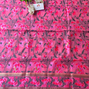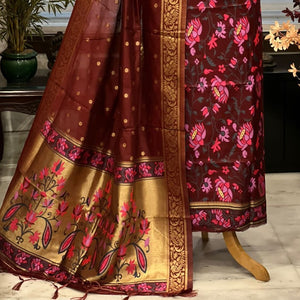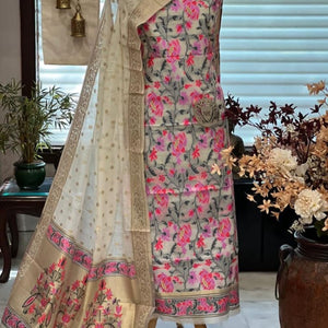Dupatta has floral design woven meticulously by skilled artisans in Banarasi style with an elegant border at the bottom. Together this set makes a very eye-catching wear. It is comfortable and classy. Accessorising it with just a pair of earrings is enough to uplift your appearance.