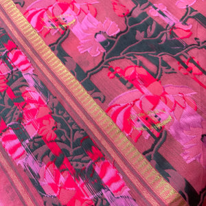 Mesmerising Cotton Silk fabric with beautiful golden jari design with red rose motifs embossed in golden jari weave with a plain cotton silk cream bottom.
