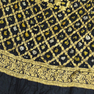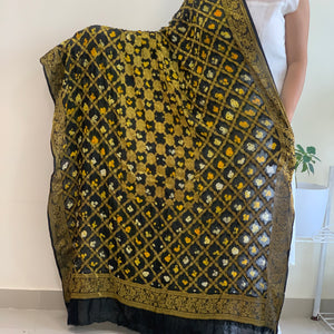 For all black lovers, this lovely Bandhani dupatta is a must have in your ethnic wardrobe. A banarasi woven dupatta in art-silk which has been carefully dyed by artisans from Rajasthan. This dupatta has a black base with golden zari topped with yellow and white bandhej knots.