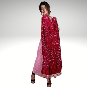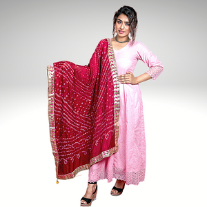 Curate the perfect look with this red Bandhani dupatta handcrafted lovingly by our rural artisans. It has a gotapatti border which adds to the overall beauty of this dupatta. The Bandhani print makes it an excellent wardrobe addition. It can be paired with a kurta set or lehenga. Carry this Bandhani dupatta and see the magic evoked.