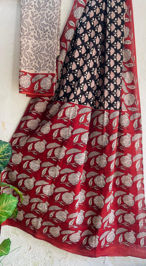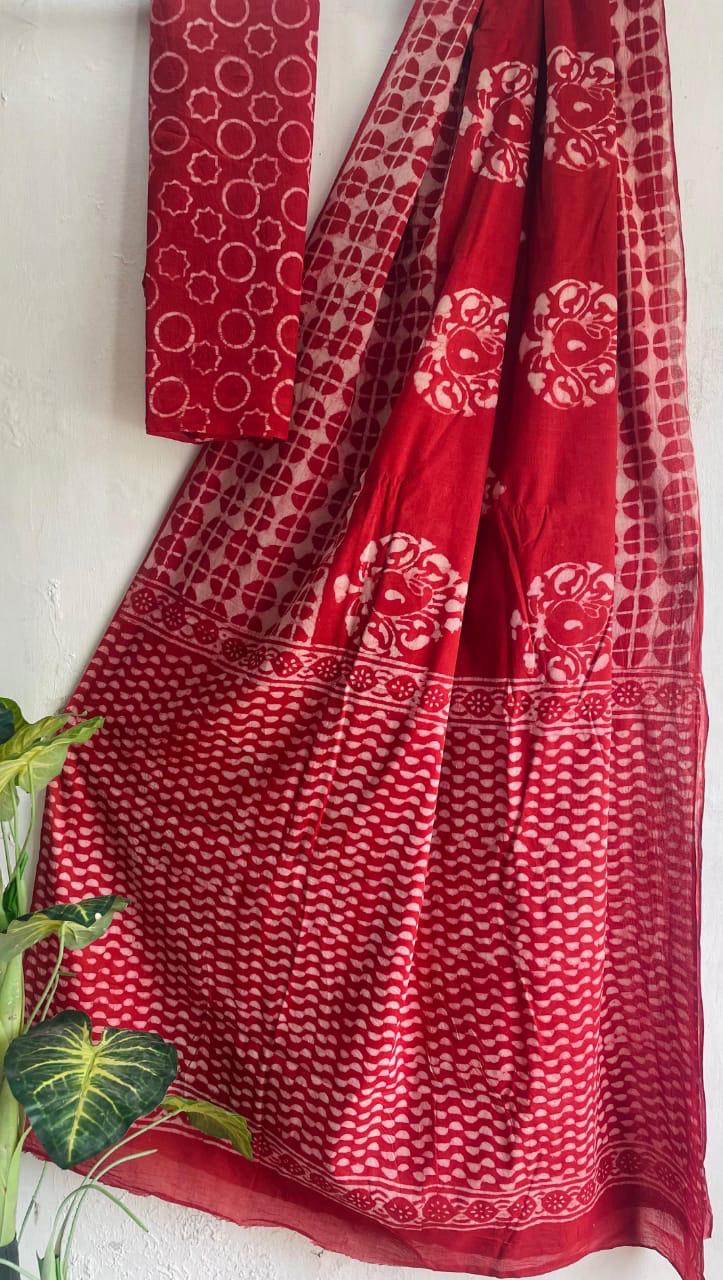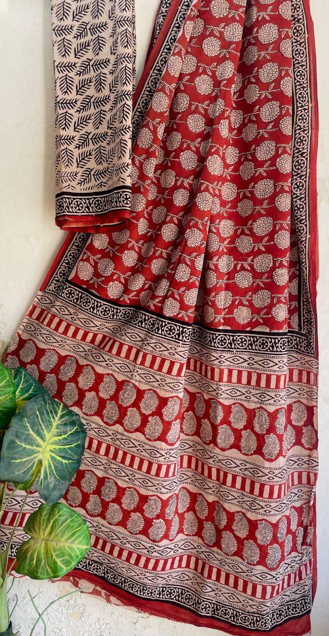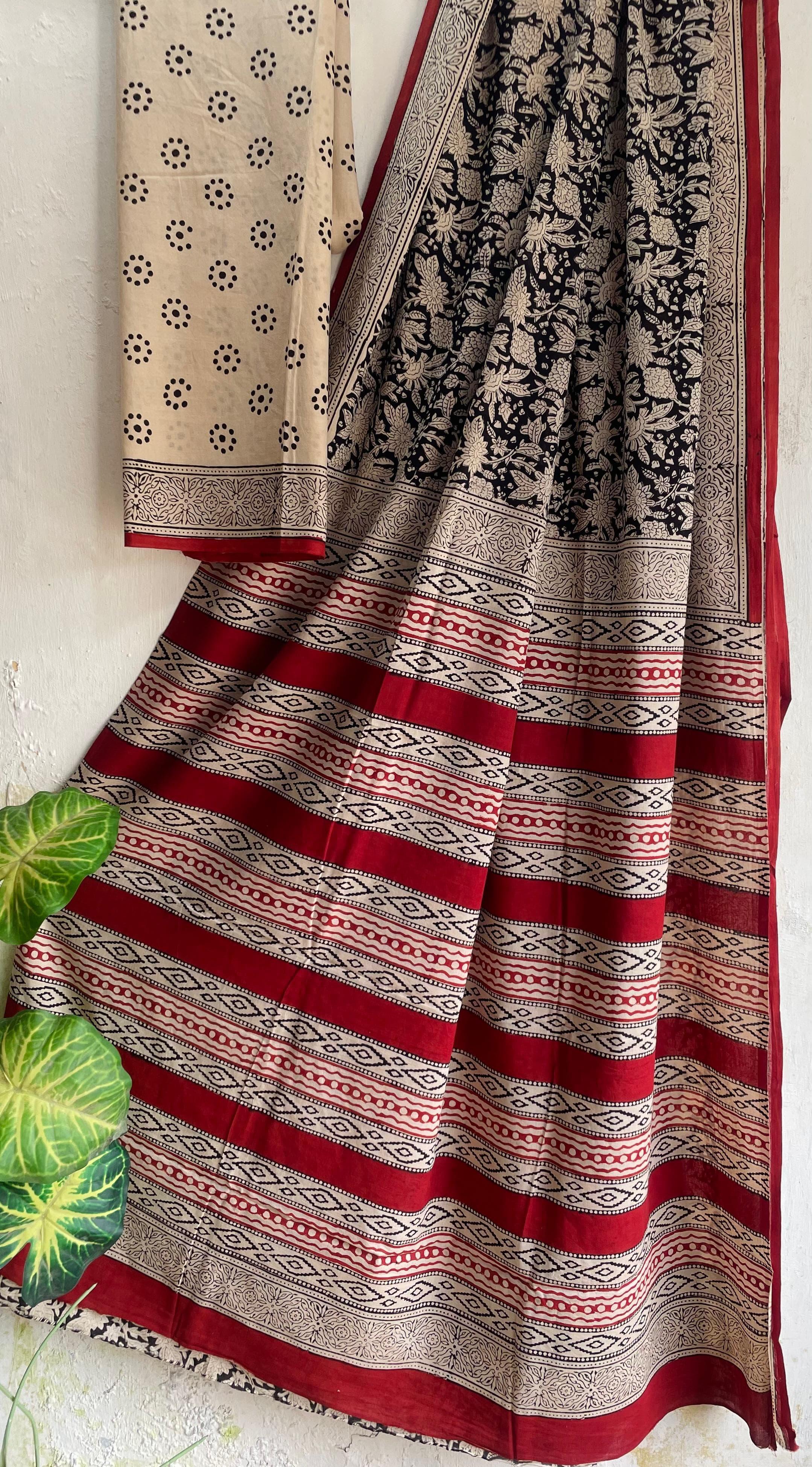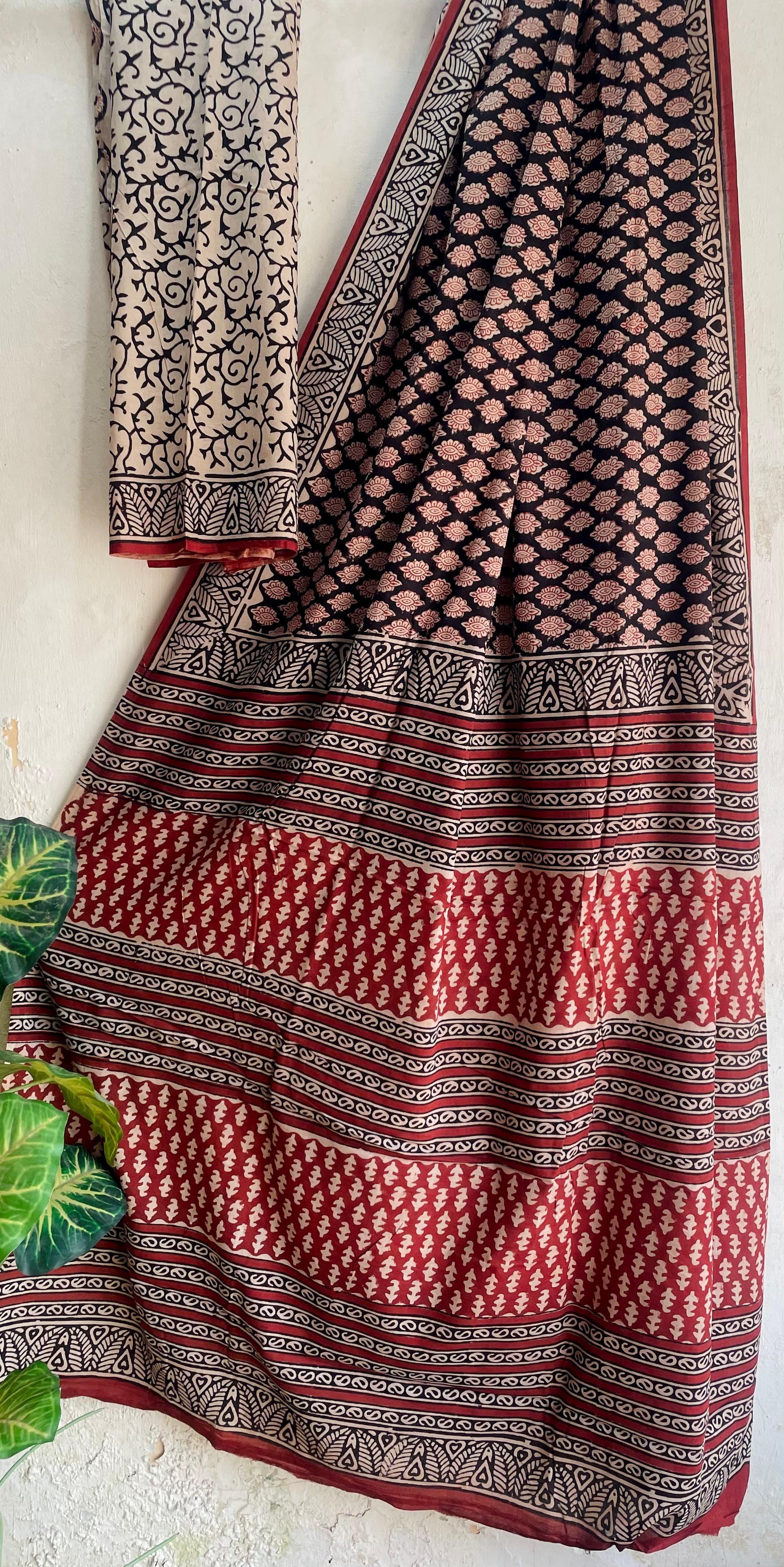 From the village of Bagru, comes this beautiful, light and hand crafted Mul Cotton Saree. Perfect for a casual day to beat the heat and yet look charming and stylish.