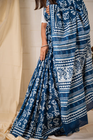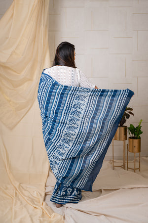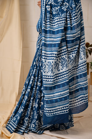 From the village of Bagru, comes this beautiful, light and hand crafted Mul Cotton Saree. Perfect for a casual day to beat the heat and yet look charming and stylish.