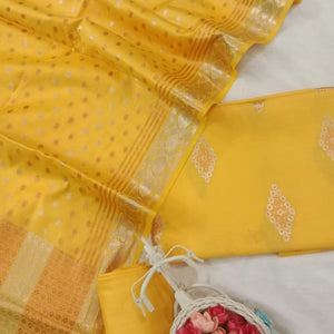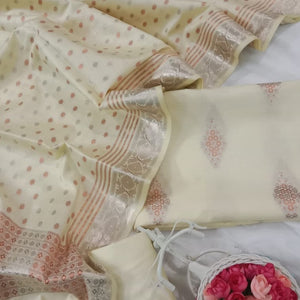 Mesmerising Chiniya Silk fabric with beautiful mean golden jari design with small motifs embossed in golden jari weave with a plain cotton silk solid bottom.