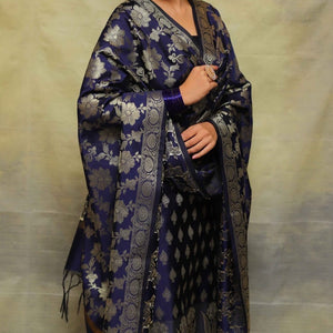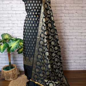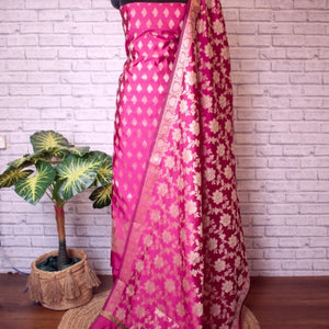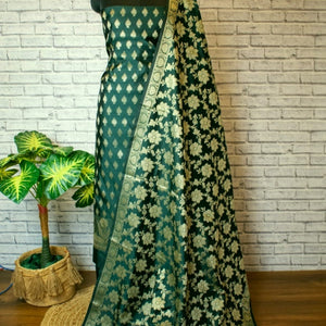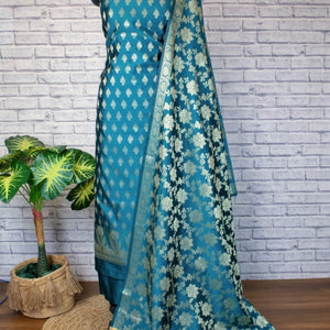 A beautiful banarasi Katan Silk dyeable Material, a splendid designer woven Jari dupatta, butti design kurta and solid bottom.