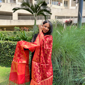 We bring to you an all-time classic banarasi cotton silk dupatta, specially woven with all over jaal zari just enough to add a touch of classiness to your ethnic outfit.