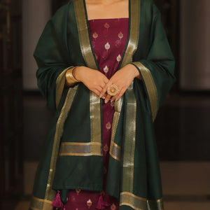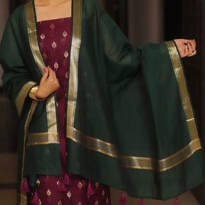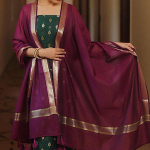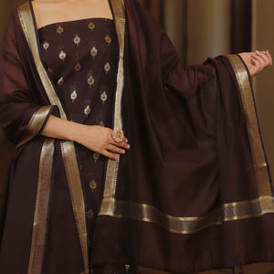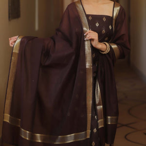 Dupatta is woven meticulously by skilled artisans in Banarasi style with an elegant border at the bottom. Together this set makes a very eye-catching wear. It is comfortable and classy. Accessorising it with just a pair of earrings is enough to uplift your appearance.