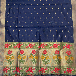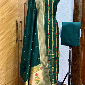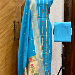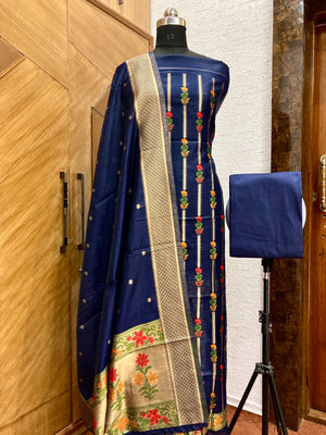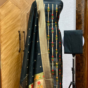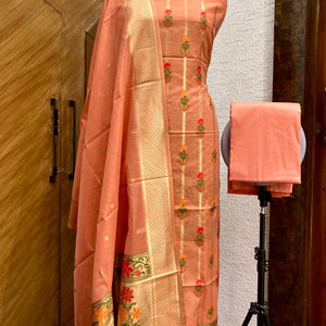 Dupatta has floral design woven meticulously by skilled artisans in Banarasi style with an elegant border at the bottom. Together this set makes a very eye-catching wear. It is comfortable and classy. Accessorising it with just a pair of earrings is enough to uplift your appearance.