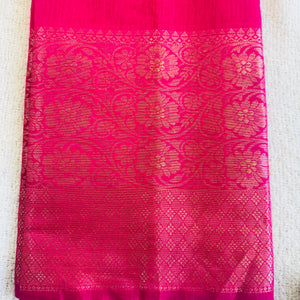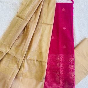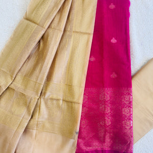 A beautiful banarasi Cotton Silk suit fabric with embossed golden jari and a splendid embossed Silver Jari woven dupatta, butti design kurta and solid bottom.