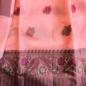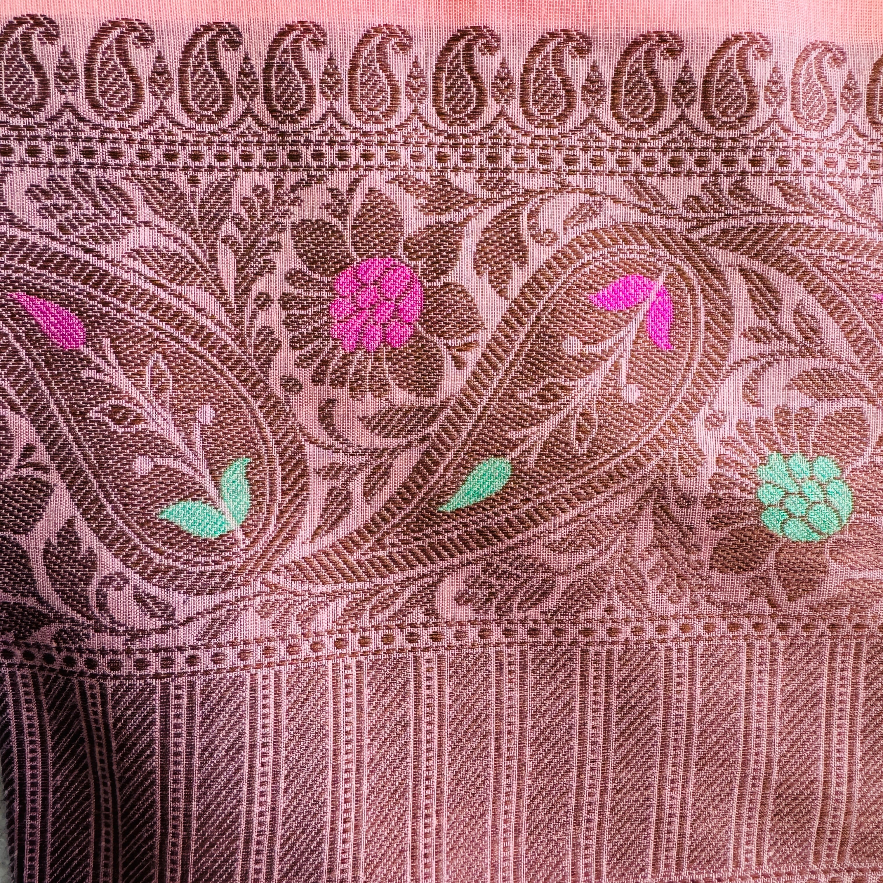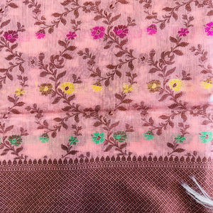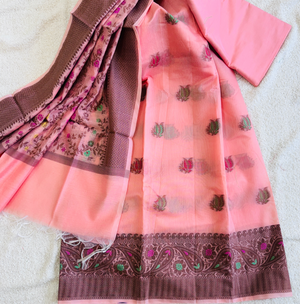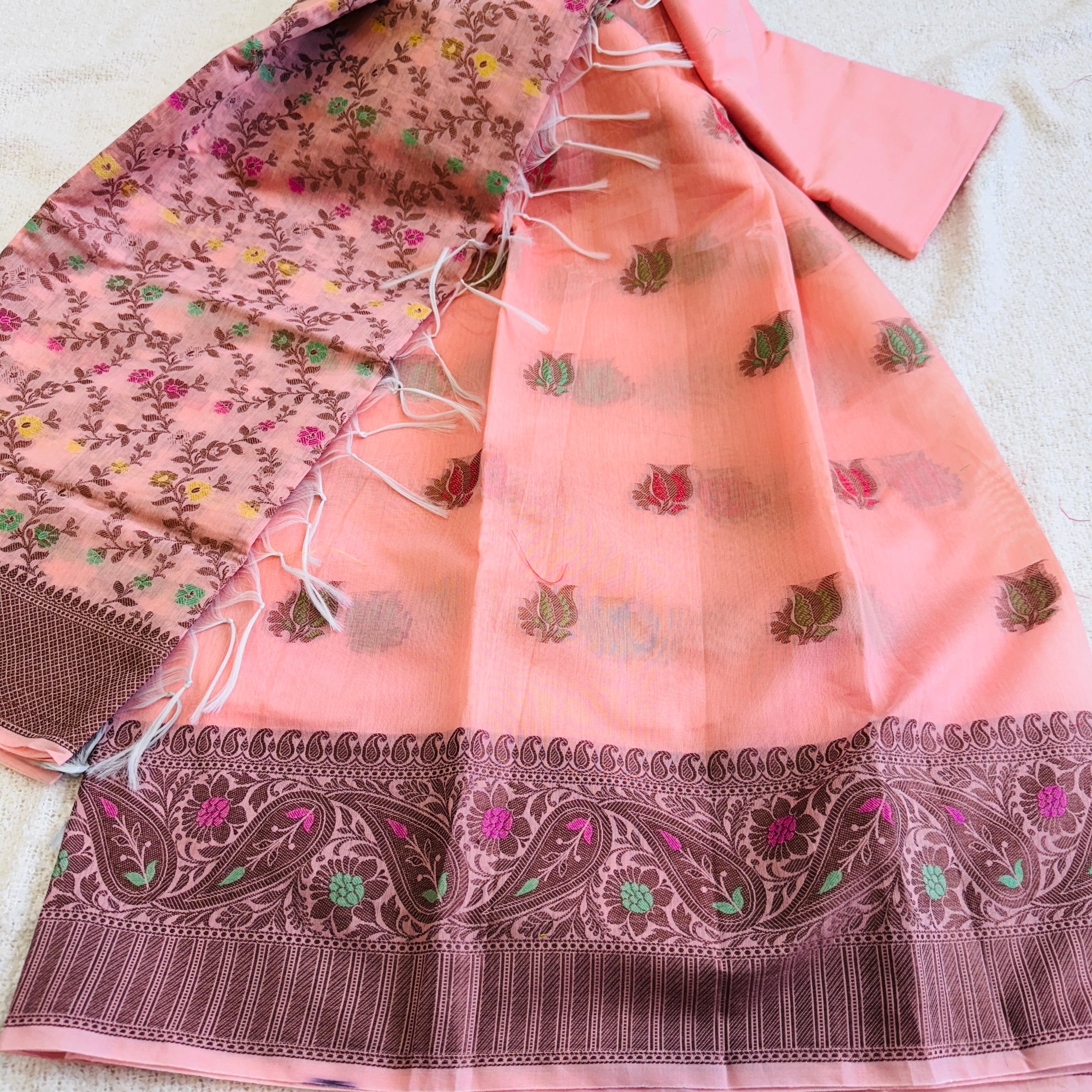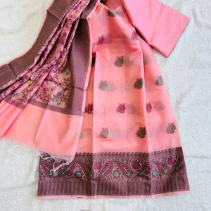 A beautiful banarasi Cotton Silk suit fabric with soft Rahim and a splendid embossed woven dupatta, butti design kurta and solid bottom.