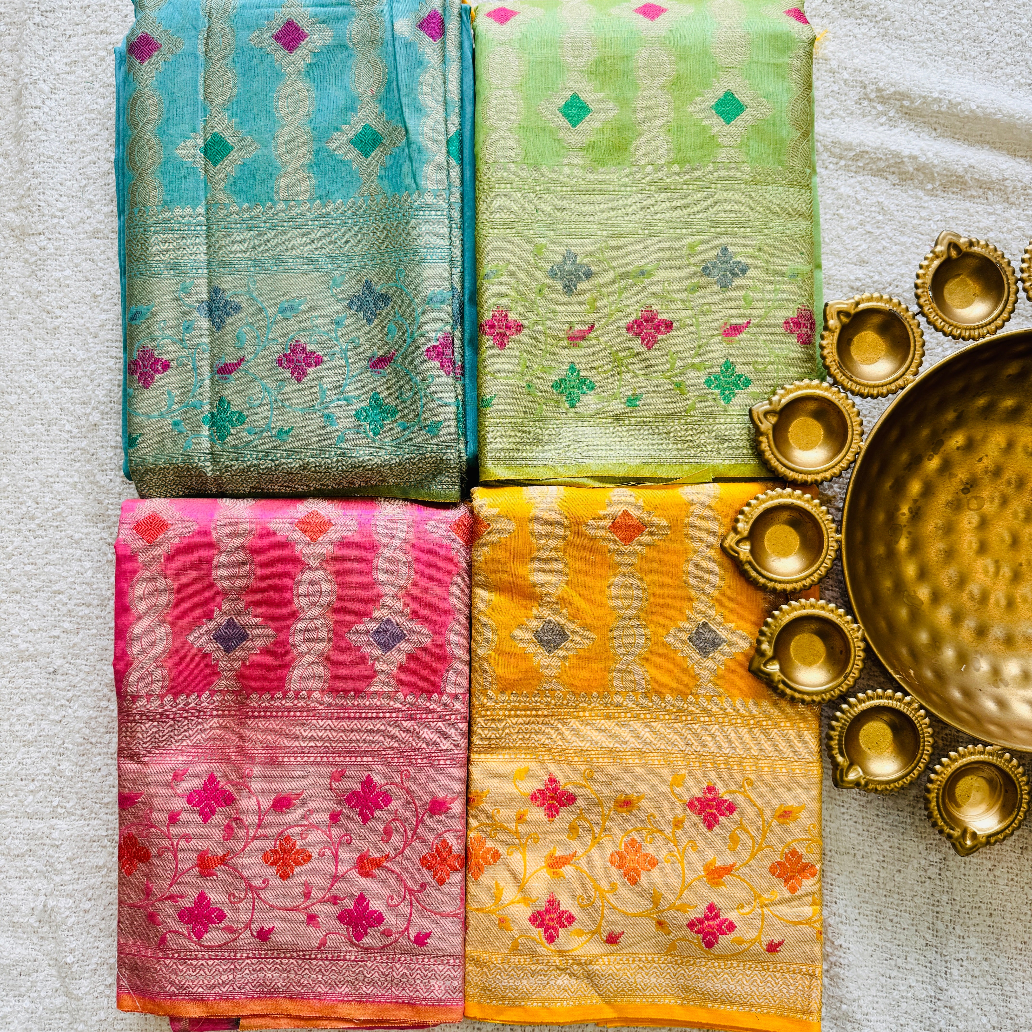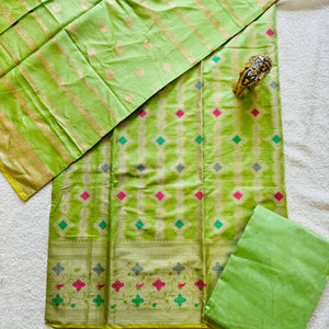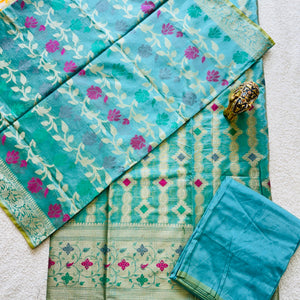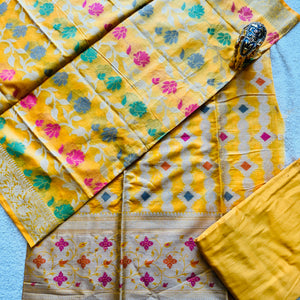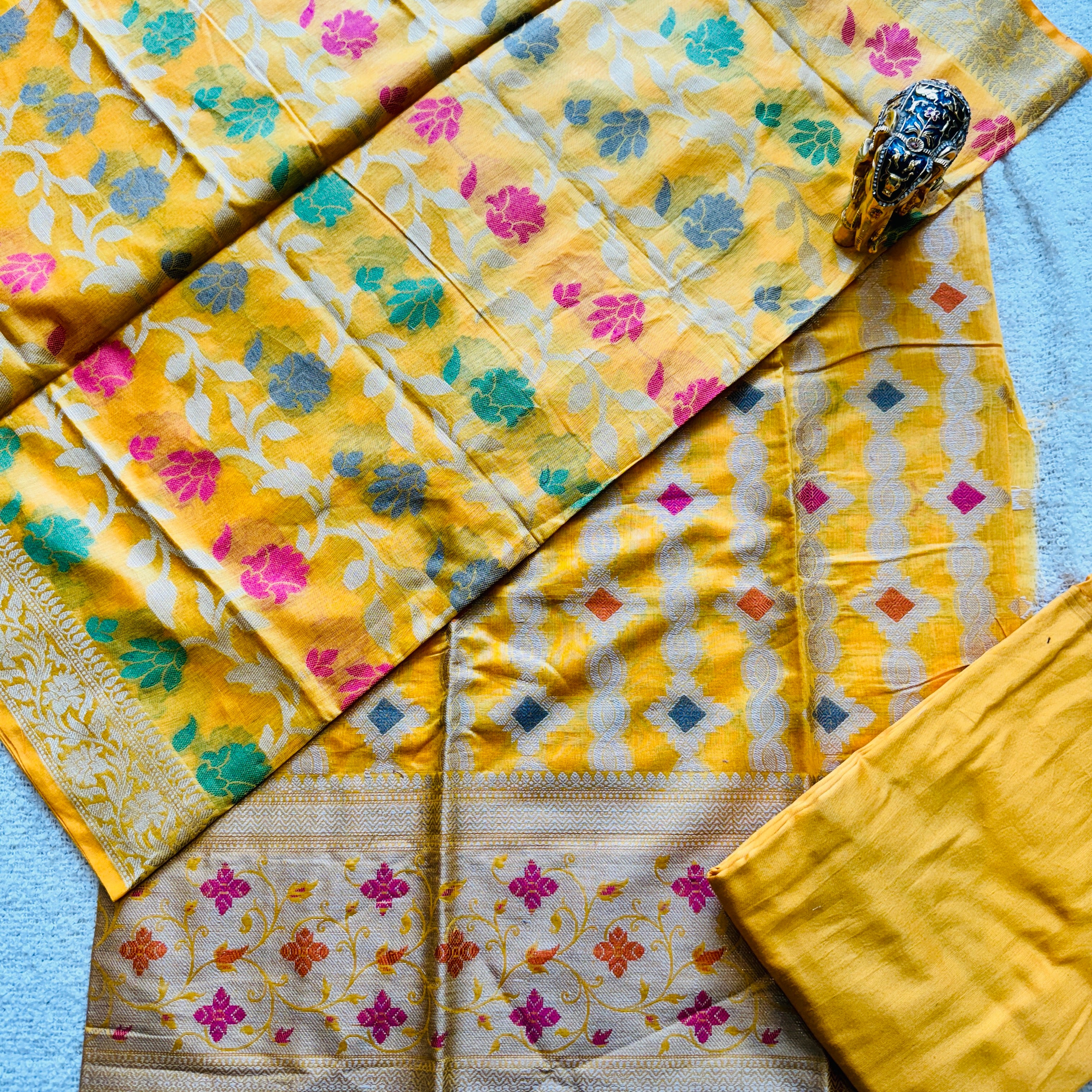 A beautiful banarasi Cotton Silk suit fabric with embossed golden jari and a splendid embossed Silver Jari woven dupatta, butti design kurta and solid bottom.