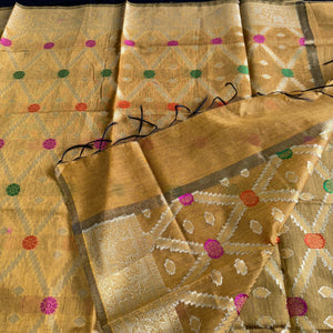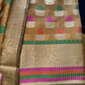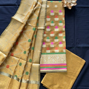 A beautiful banarasi Cotton Silk suit fabric with embossed golden jari and a splendid embossed Silver Jari woven dupatta, butti design kurta and solid bottom.