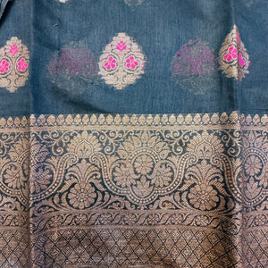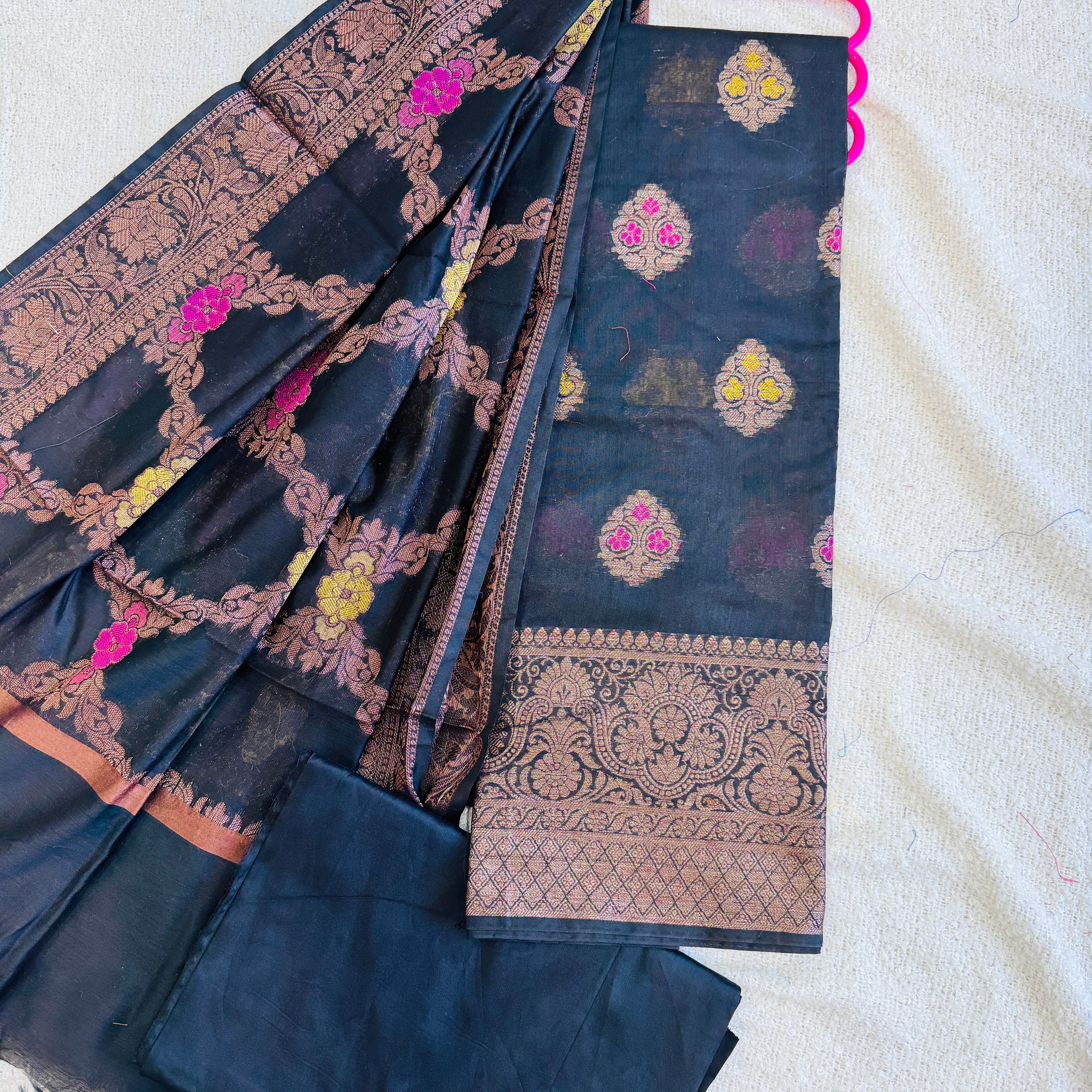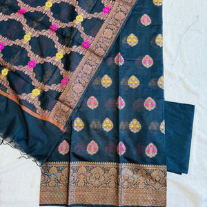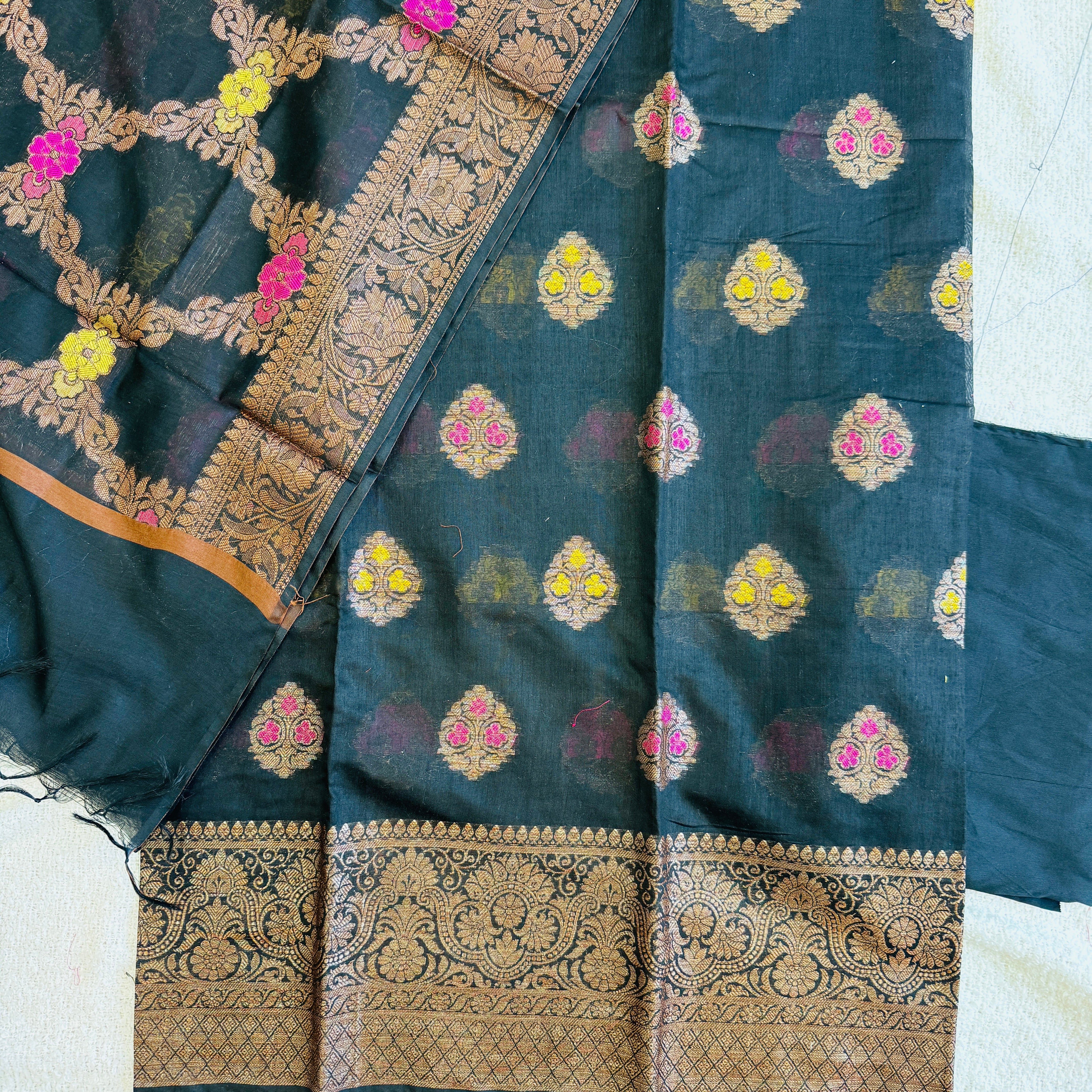 A beautiful banarasi Cotton Silk suit fabric with embossed golden jari and a splendid embossed Silver Jari woven dupatta, butti design kurta and solid bottom.