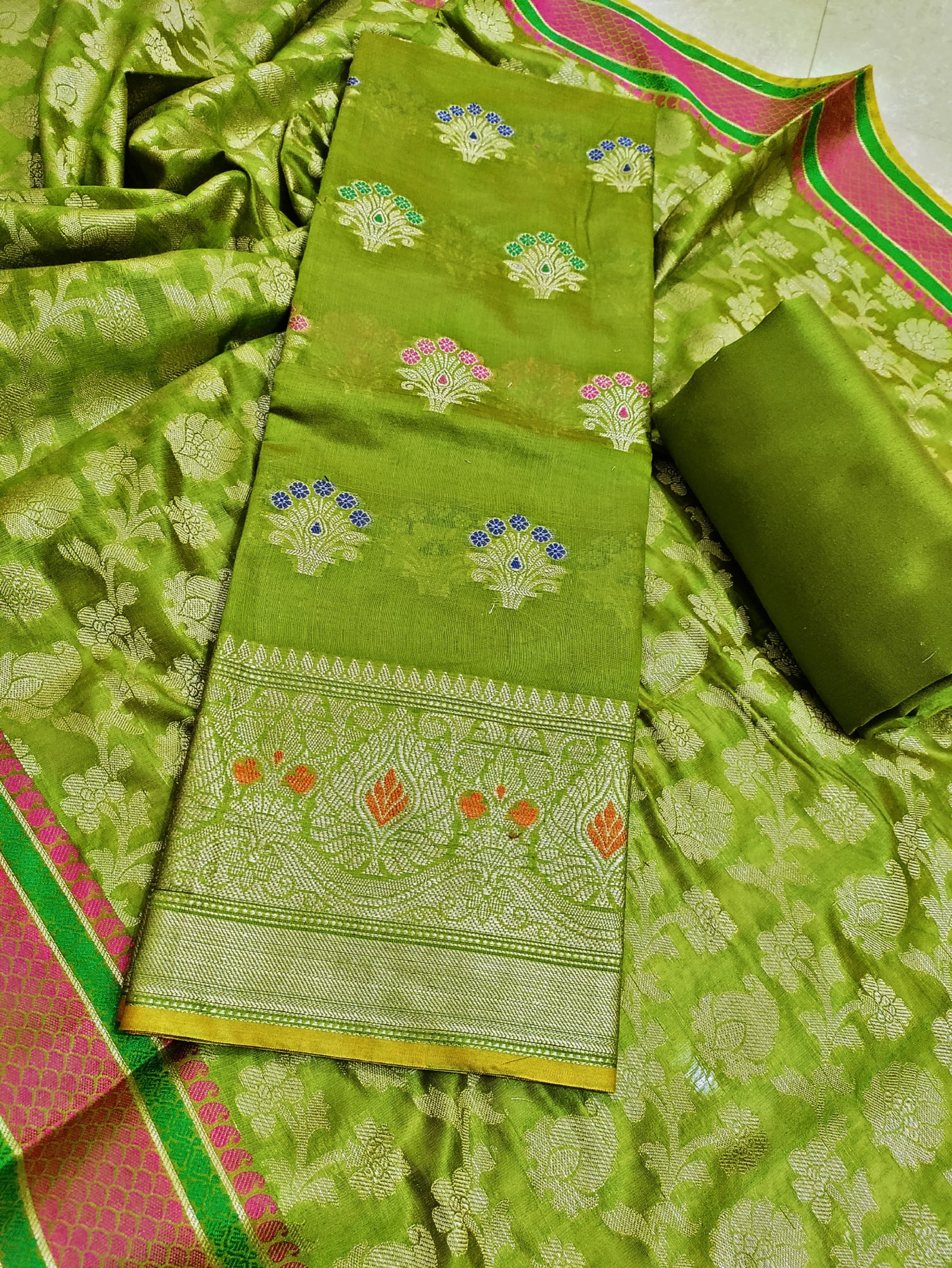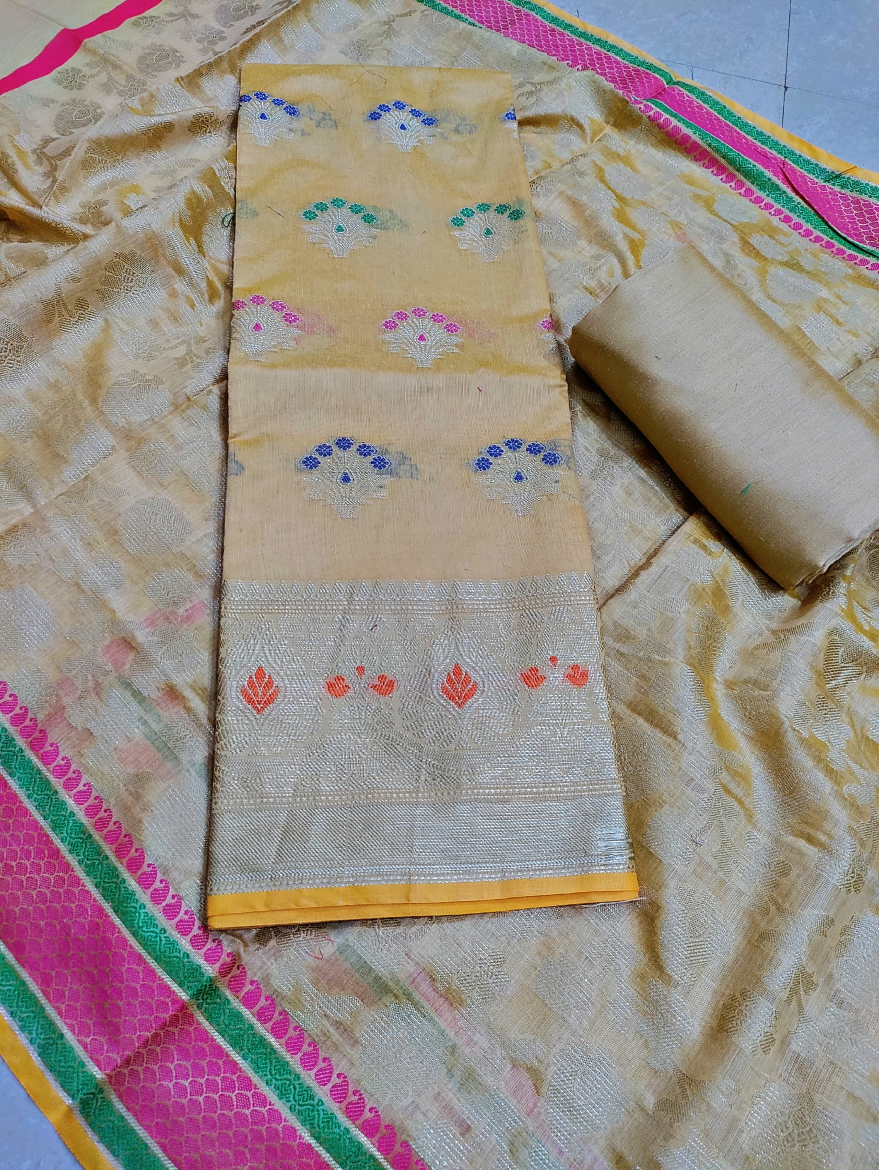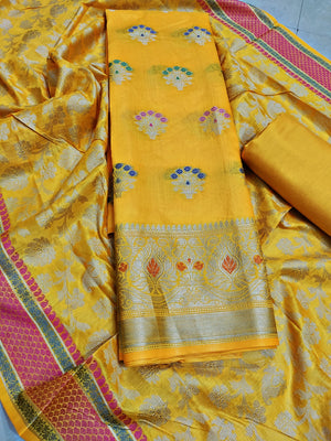 A beautiful banarasi Cotton Silk suit fabric with embossed golden jari and a splendid embossed Silver Jari woven dupatta, butti design kurta and solid bottom.