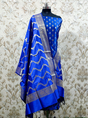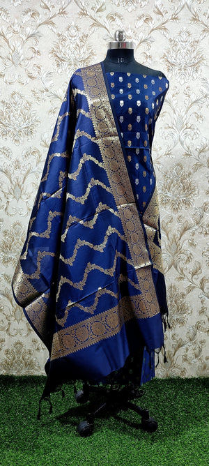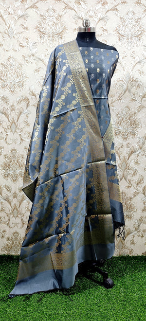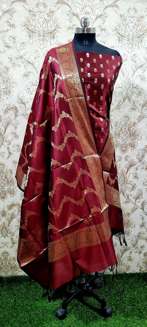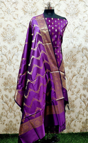 A beautiful banarasi Mix Katan Silk suit fabric with elegant butti weaving, a splendid designer zari woven dupatta with all over jacquard Weaving with Jari, butti design kurta and solid bottom.