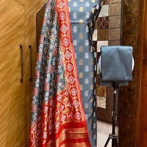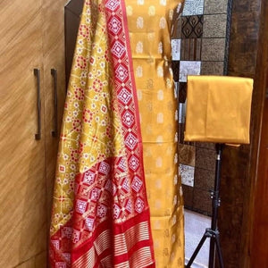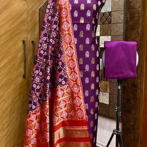 A beautiful banarasi Mix Katan Silk suit fabric with elegant butti weaving, a splendid designer dupatta with all over jacquard Weaving with Jari, butti design kurta and solid bottom.
