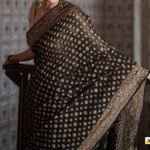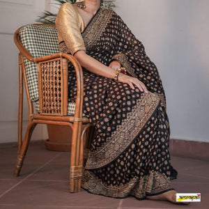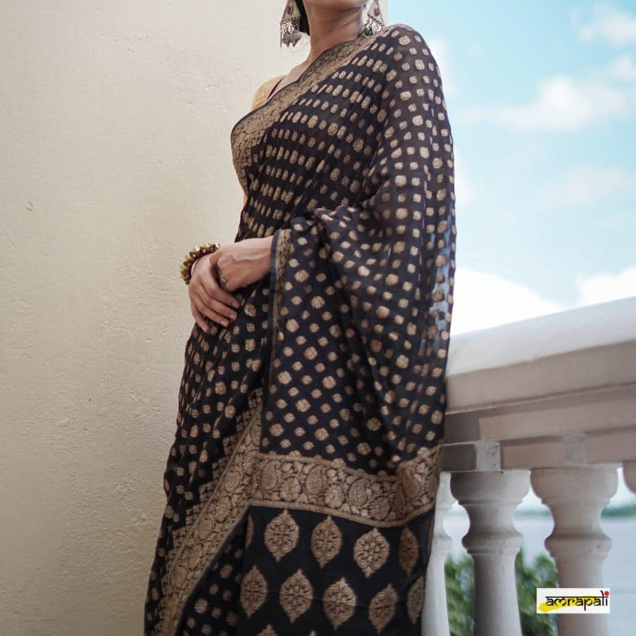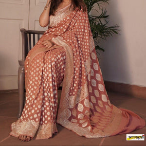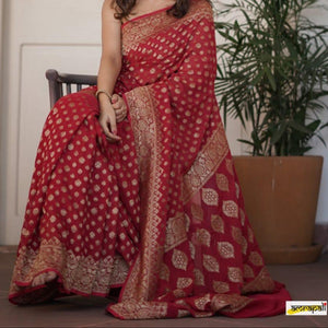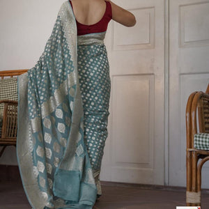 Banarasi Semi Georgette Alfi Saree is a must-have for all saree lovers it is a blend of beauty and elegance. It has both Banarasi weave and traditional Alfi work on the entire cloth. It is warm and attractive, making it ideal for celebrations.