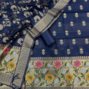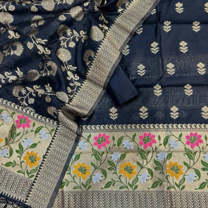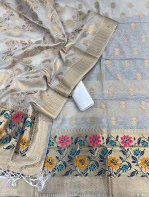 A beautiful jamdani style Cotton Handloom suit fabric, a splendid designer dupatta with all over jacquard Weaving with Jari, butti design kurta and solid bottom.
