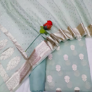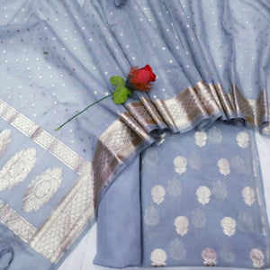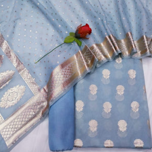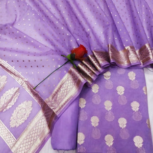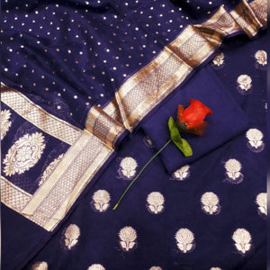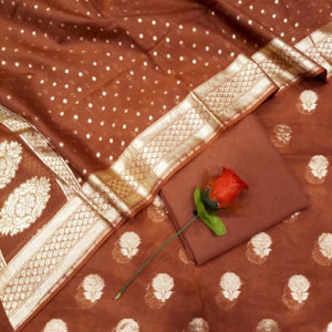 Dupatta has butti design woven meticulously by skilled artisans in Banarasi style with an elegant border at the bottom. Together this set makes a very eye-catching wear. It is comfortable and classy. Accessorising it with just a pair of earrings is enough to uplift your appearance.