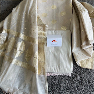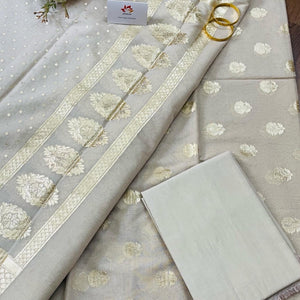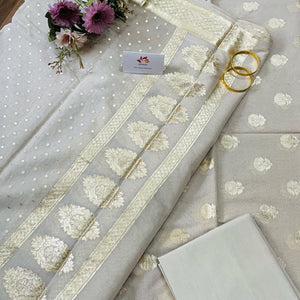 Banarasi Pure Chanderi Silk Unstitched Salwar Suit Fabric - White and Gold