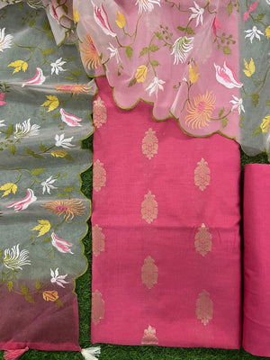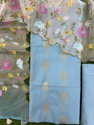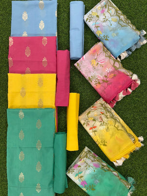 A beautiful banarasi Mercerised Silk Dyeable suit fabric with embossed Silver Jari and a splendid embossed Silver Jari woven dupatta, butti design kurta and solid bottom.