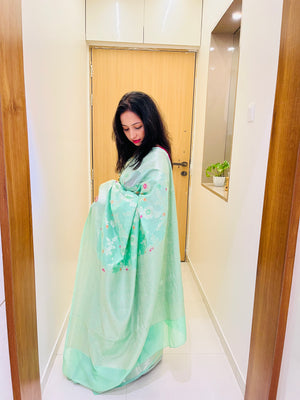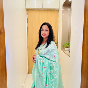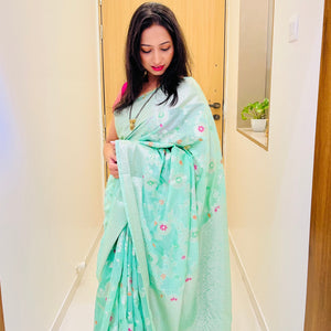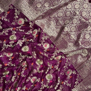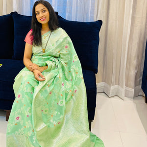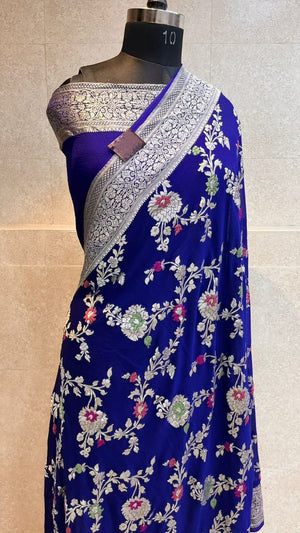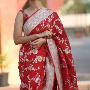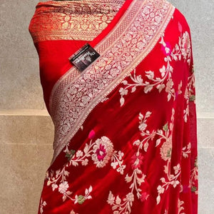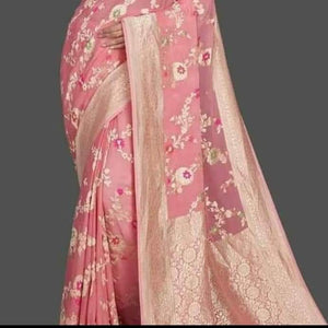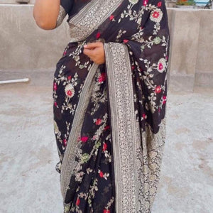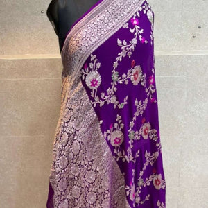 Banarasi Semi Georgette Alfi Saree is a must-have for all saree lovers it is a blend of beauty and elegance. It has both Banarasi weave and traditional Alfi work on the entire cloth. It is warm and attractive, making it ideal for celebrations.