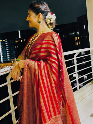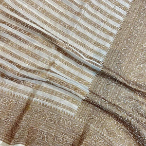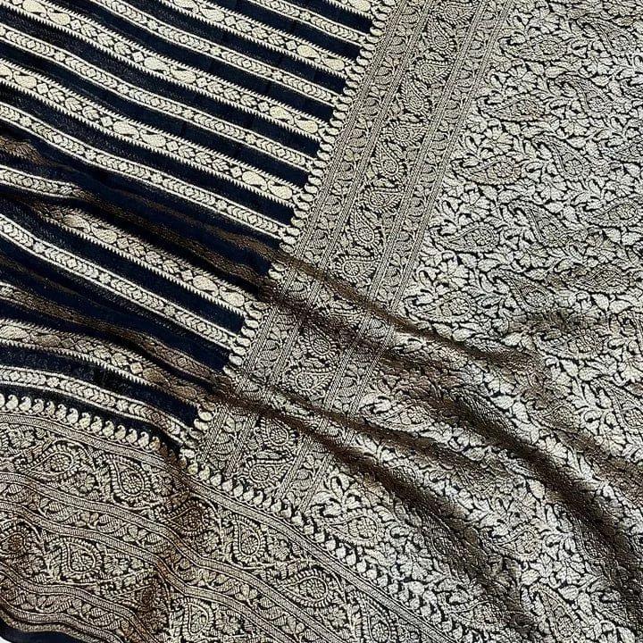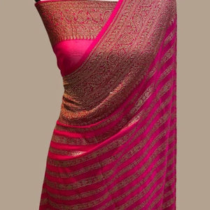 Banarasi Semi Georgette Silk Saree With Rich Jari Woven Pallu saree is a must-have for all saree lovers it is a blend of beauty and elegance. It has both Banarasi weave. It has a woven heavy border all over with Jari. It is bright and attractive, making it ideal for celebrations.