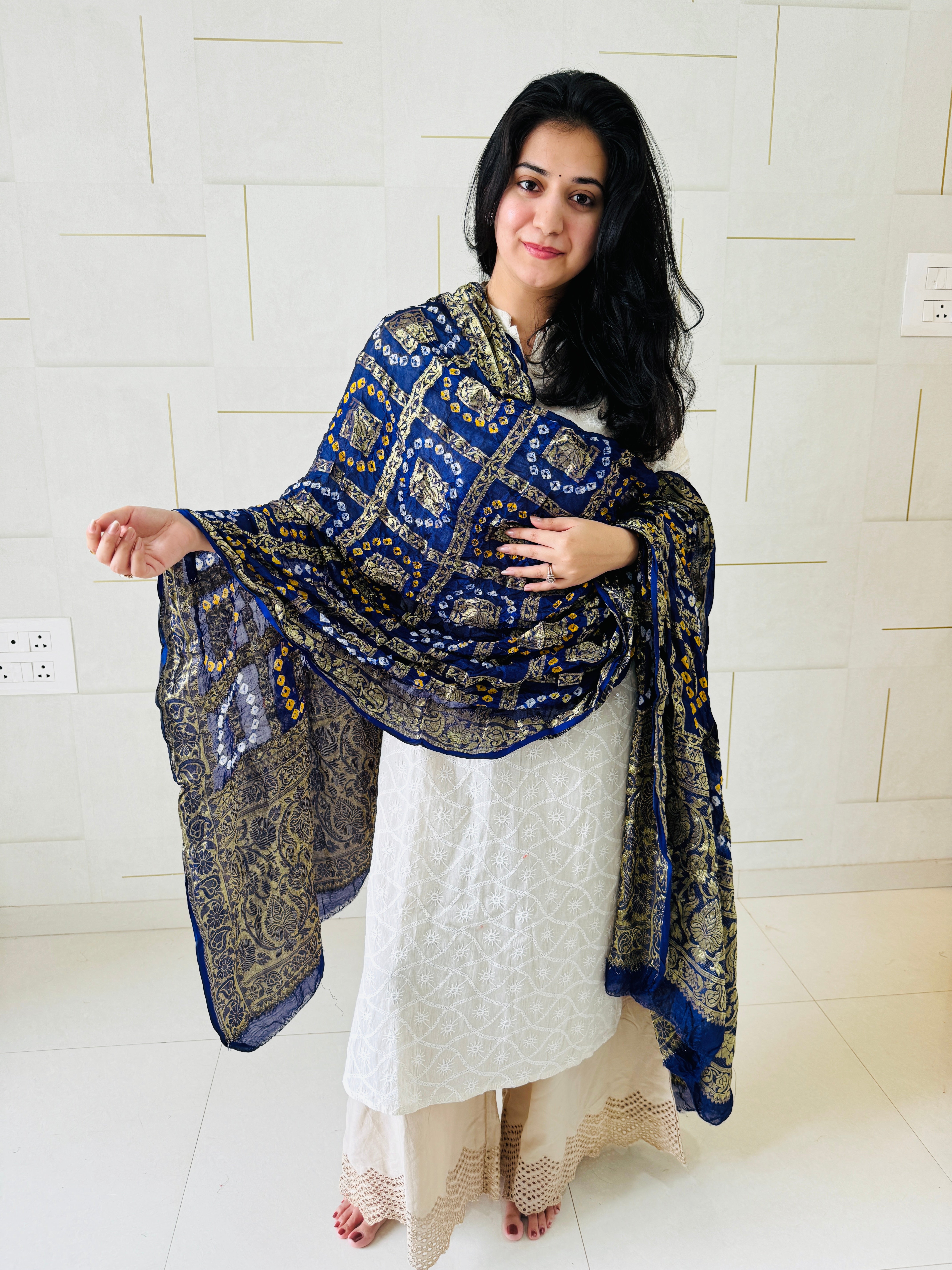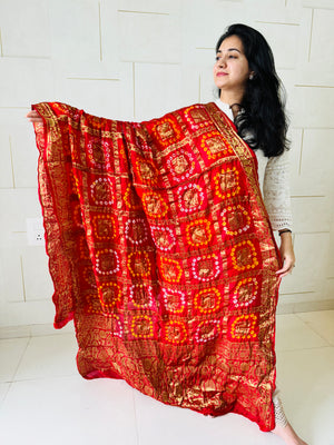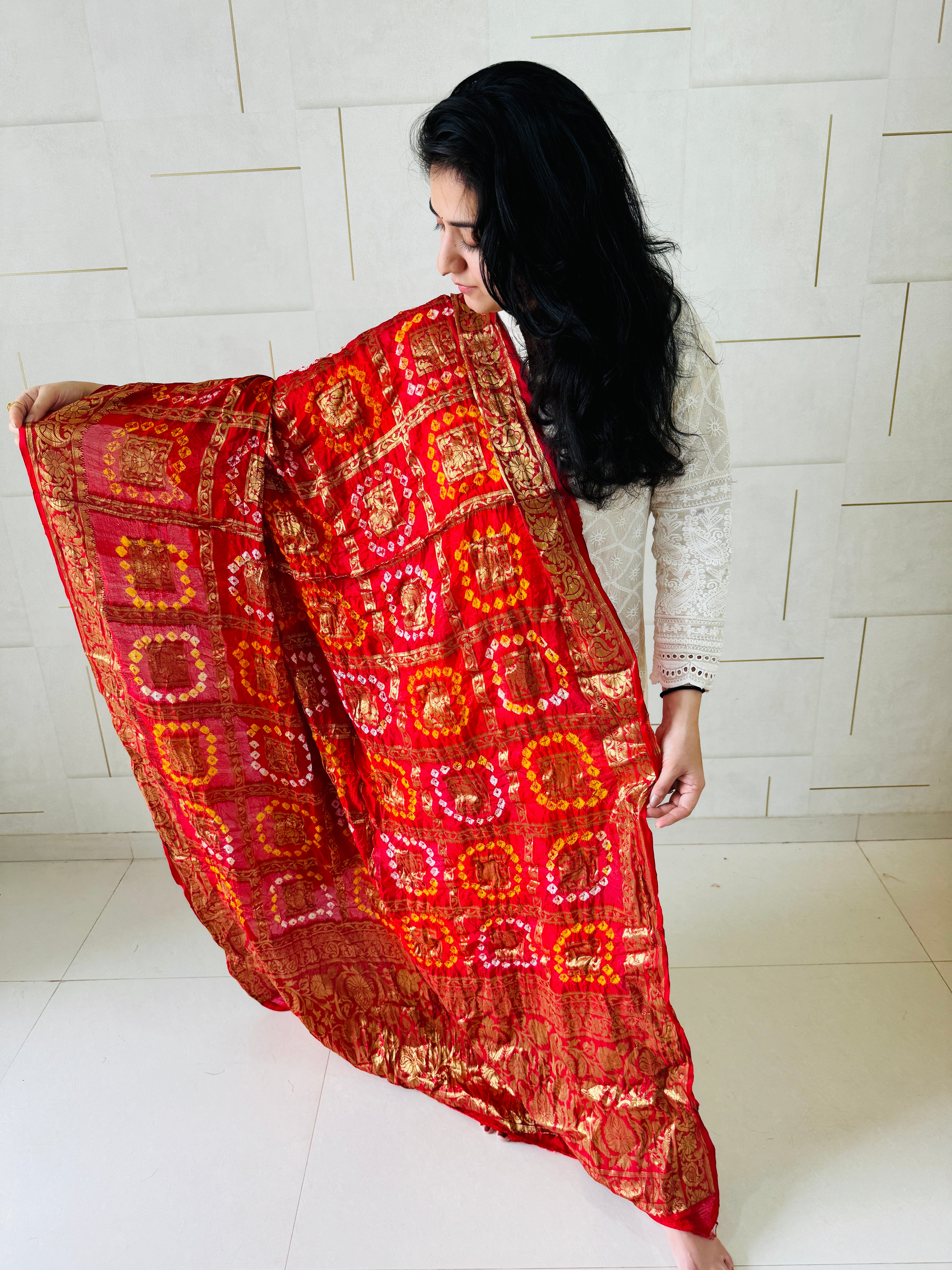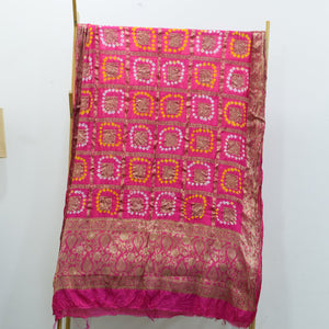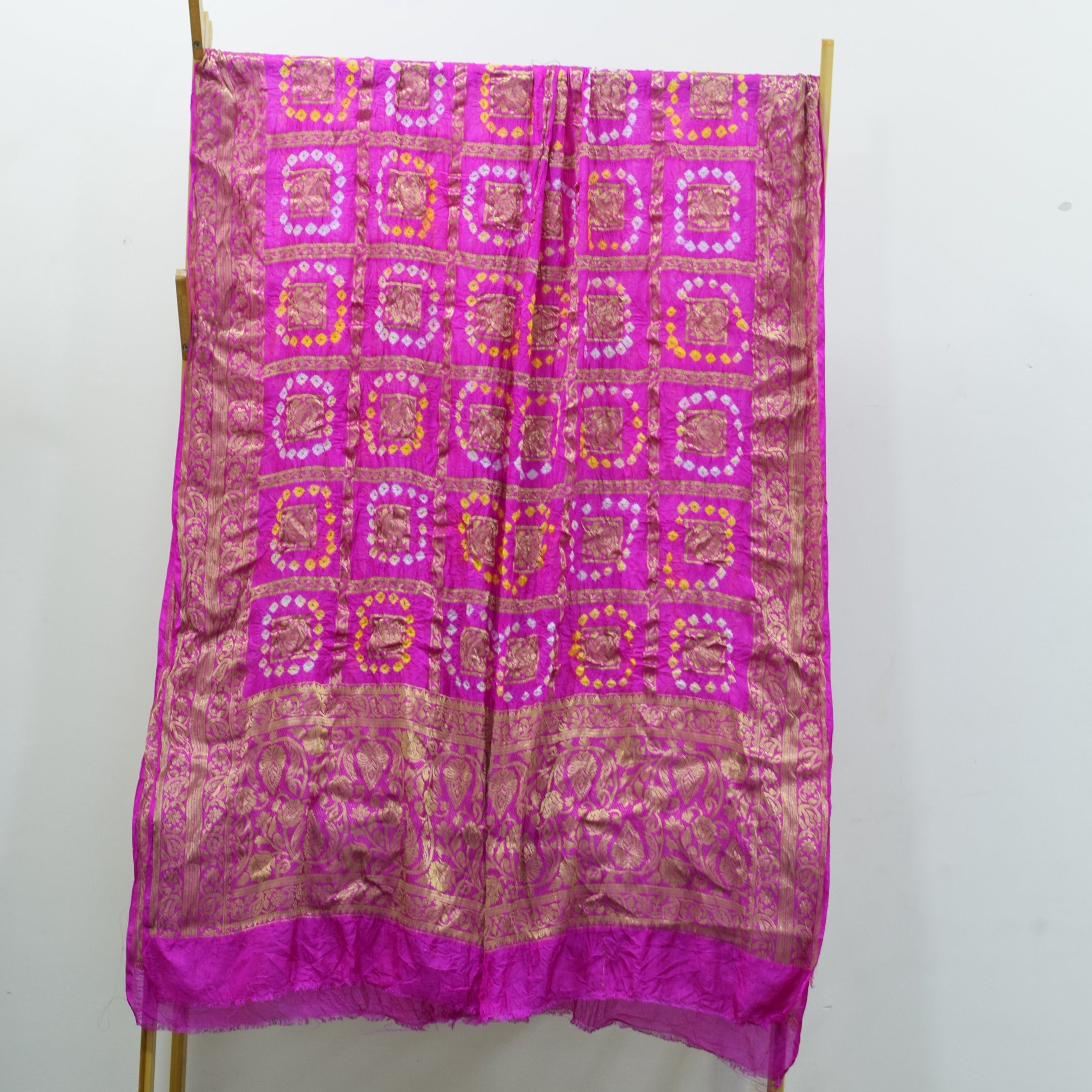 Traditional Ghatchola style dupatta in banarasi woven silk fabric. The yellow and white bandhani patterns along with the traditional motifs form a lovely pattern. This art silk dupatta is an easy choice for weddings and celebrations.