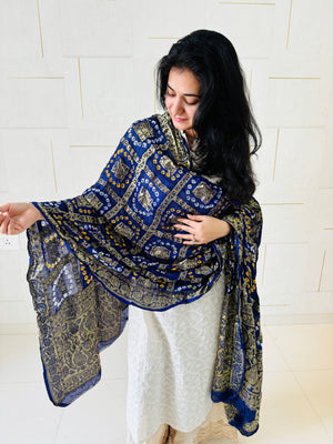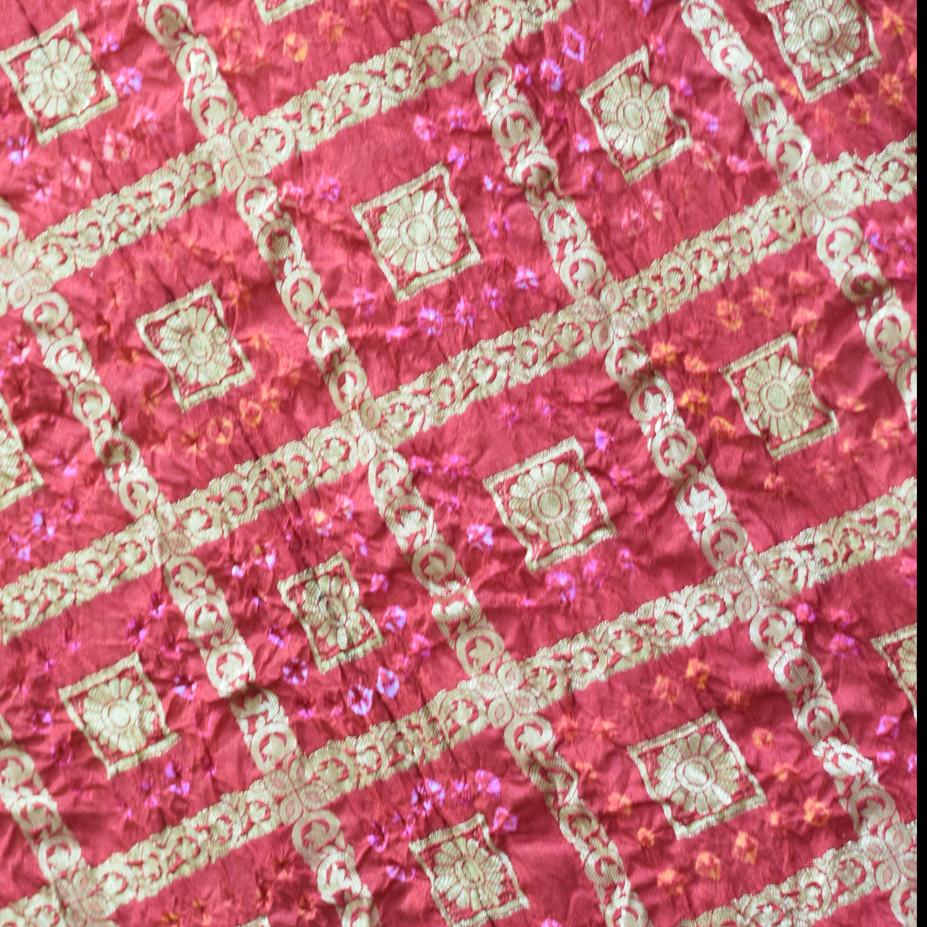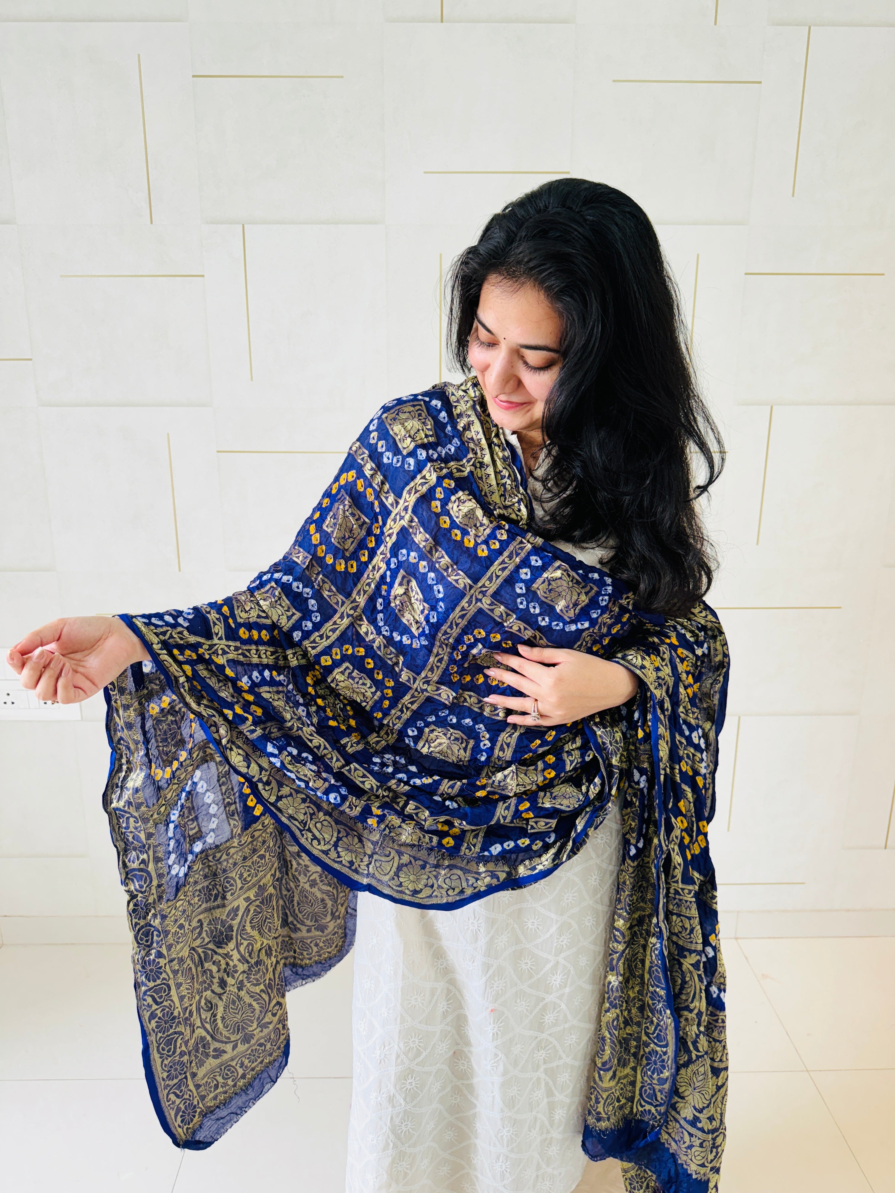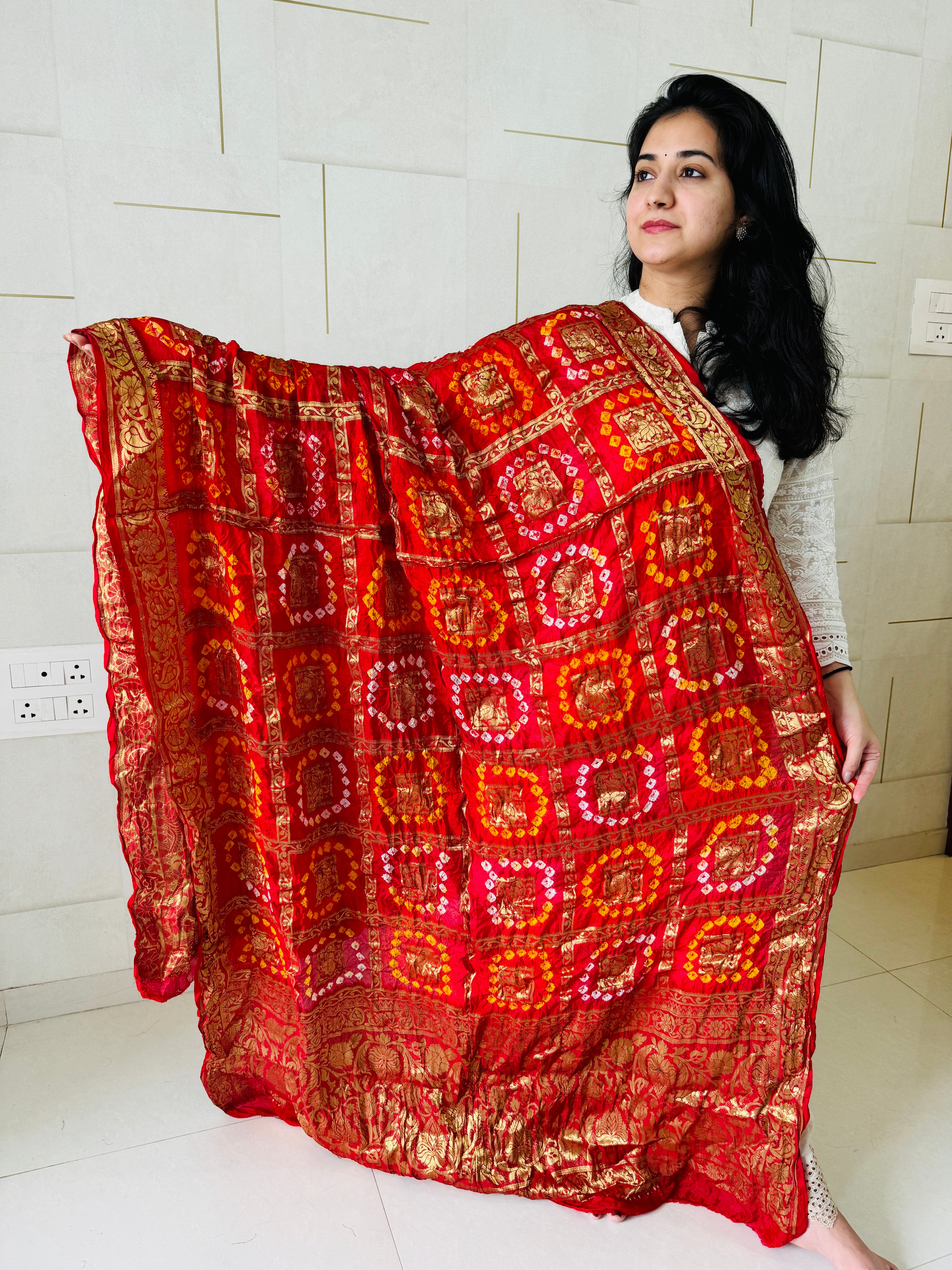 Traditional Ghatchola style dupatta in banarasi woven silk fabric. The yellow and white bandhani patterns along with the traditional motifs form a lovely pattern. This art silk dupatta is an easy choice for weddings and celebrations.
