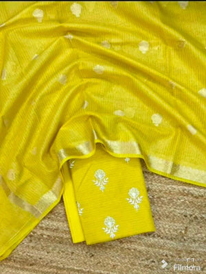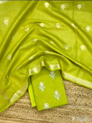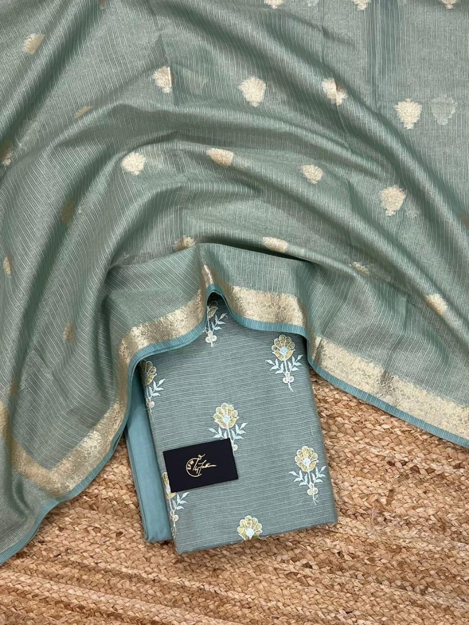 A beautiful banarasi Cotton Silk Unstitched suit fabric with embossed Silver Jari and a splendid embossed Silver Jari woven dupatta, butti design kurta and solid bottom.
