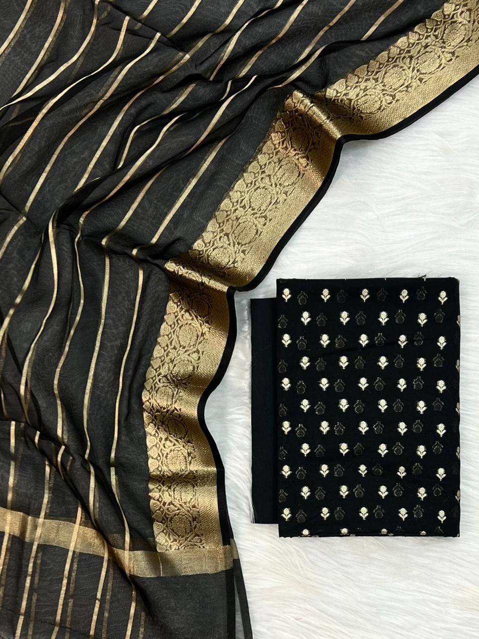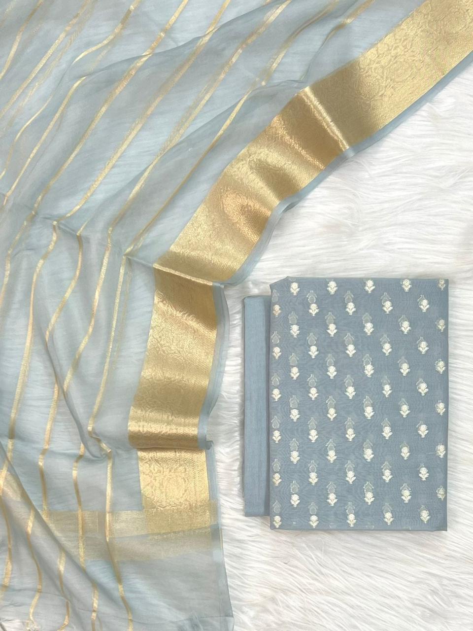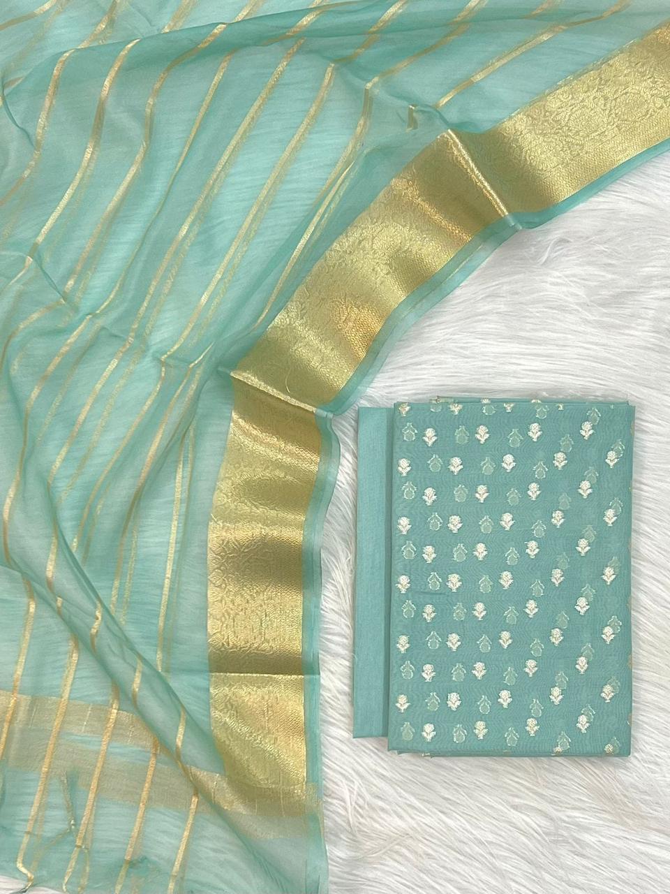 Dupatta has floral design woven meticulously by skilled artisans in Banarasi style with an elegant border at the bottom. Style it in any way, but look royal any way. This is an unstitched fabric for top, bottom and dupatta.