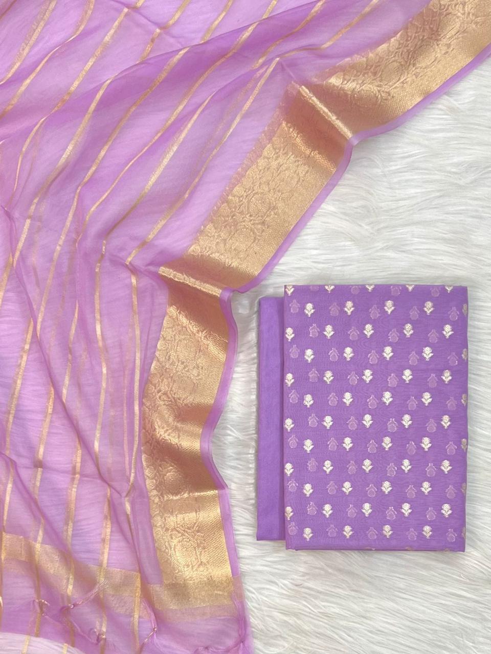 Banarasi Dress material / salwar suit fabric in Katan Silk with zari weaving, a splendid banarasi woven dupatta, Light Pink Kurta fabric with small butti motifs and also a broad border at the bottom.