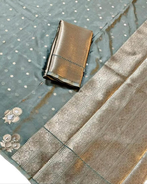 This beautiful Banarasi warm silk saree has woven blouse makes for a smart ethnic look. It has an intricate border and Jari pallu to add the glam.
