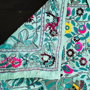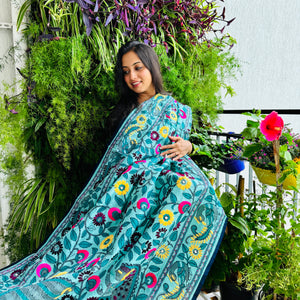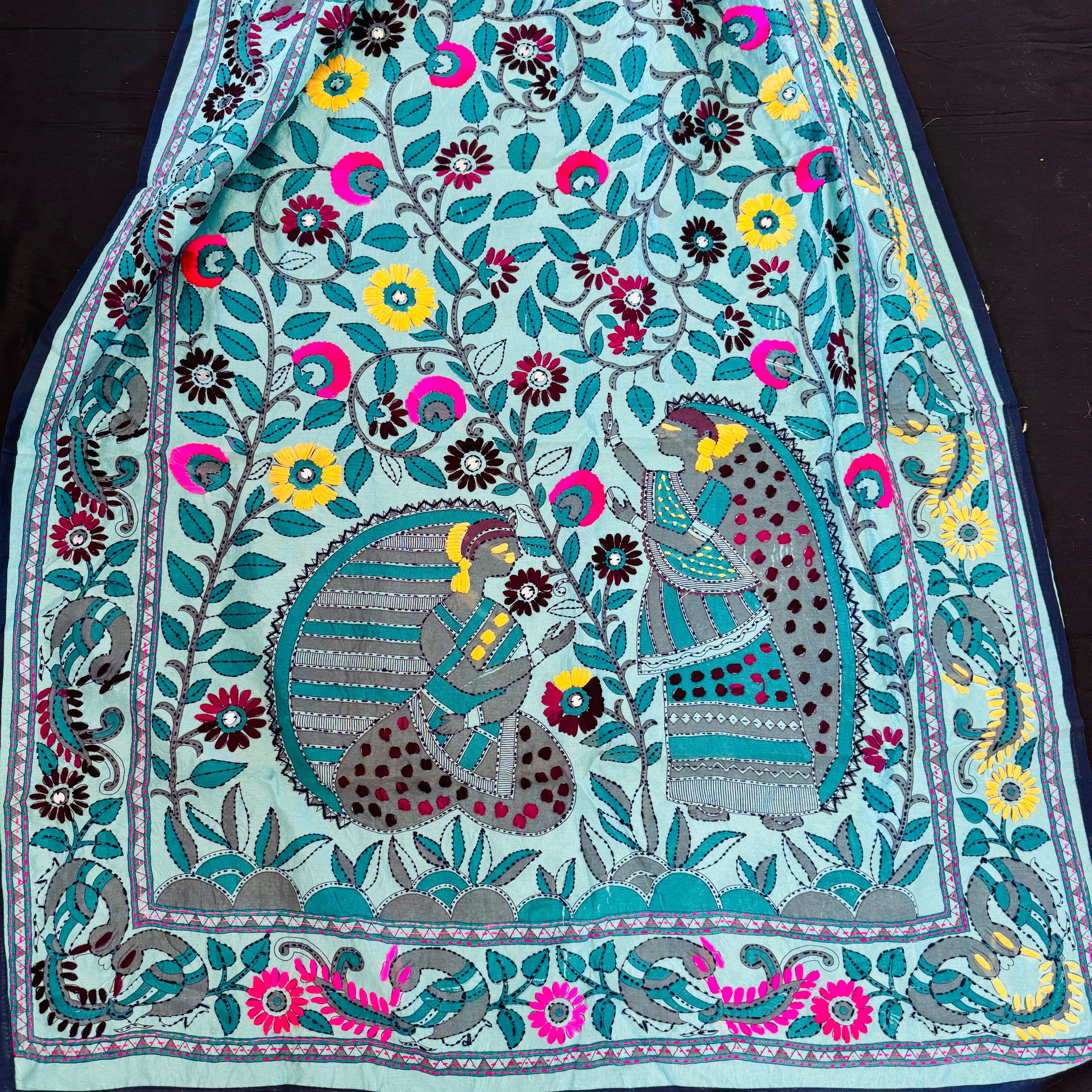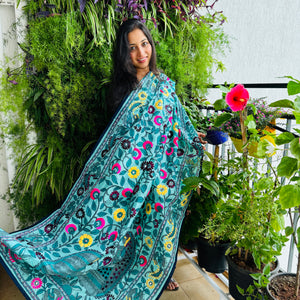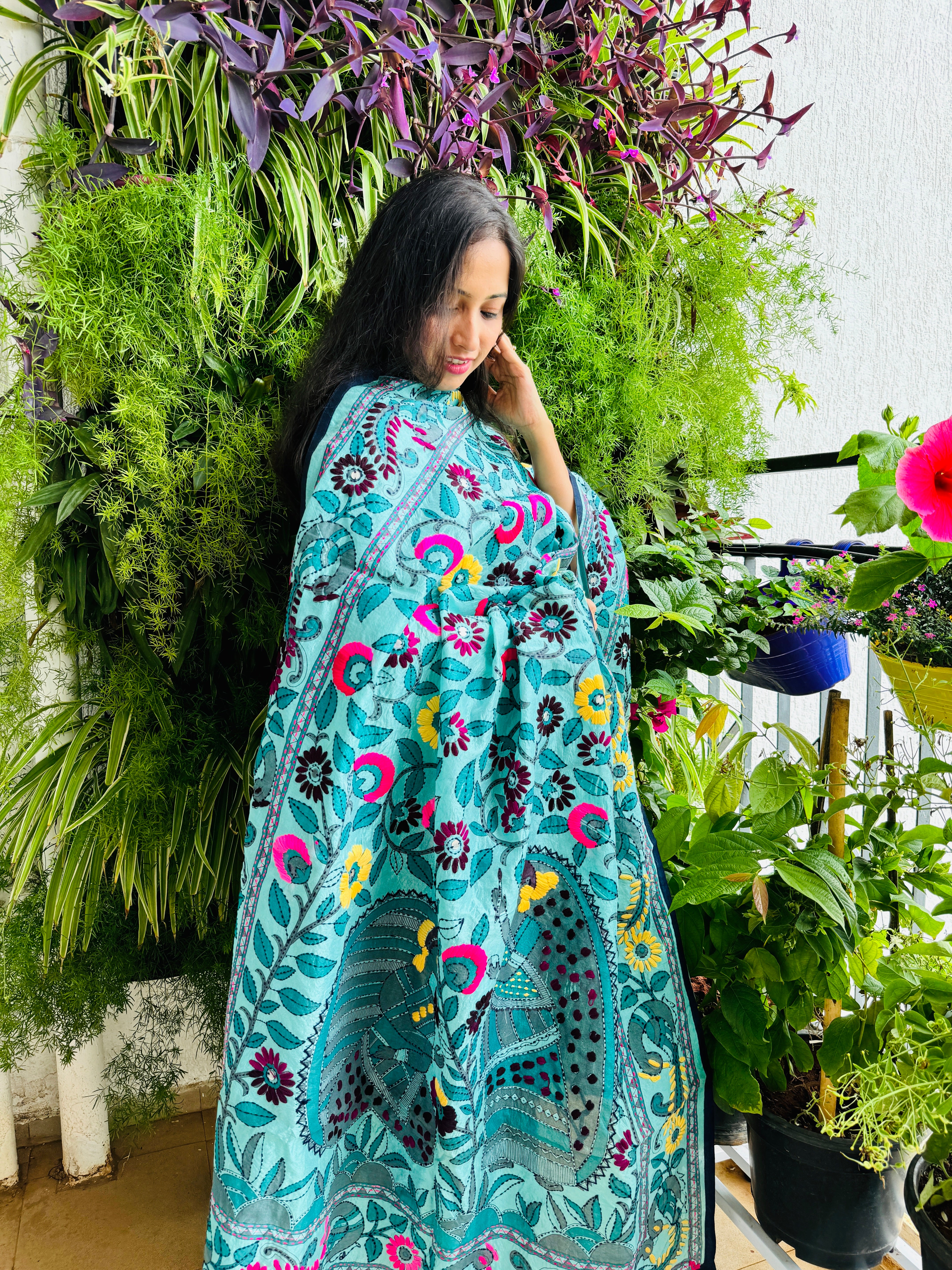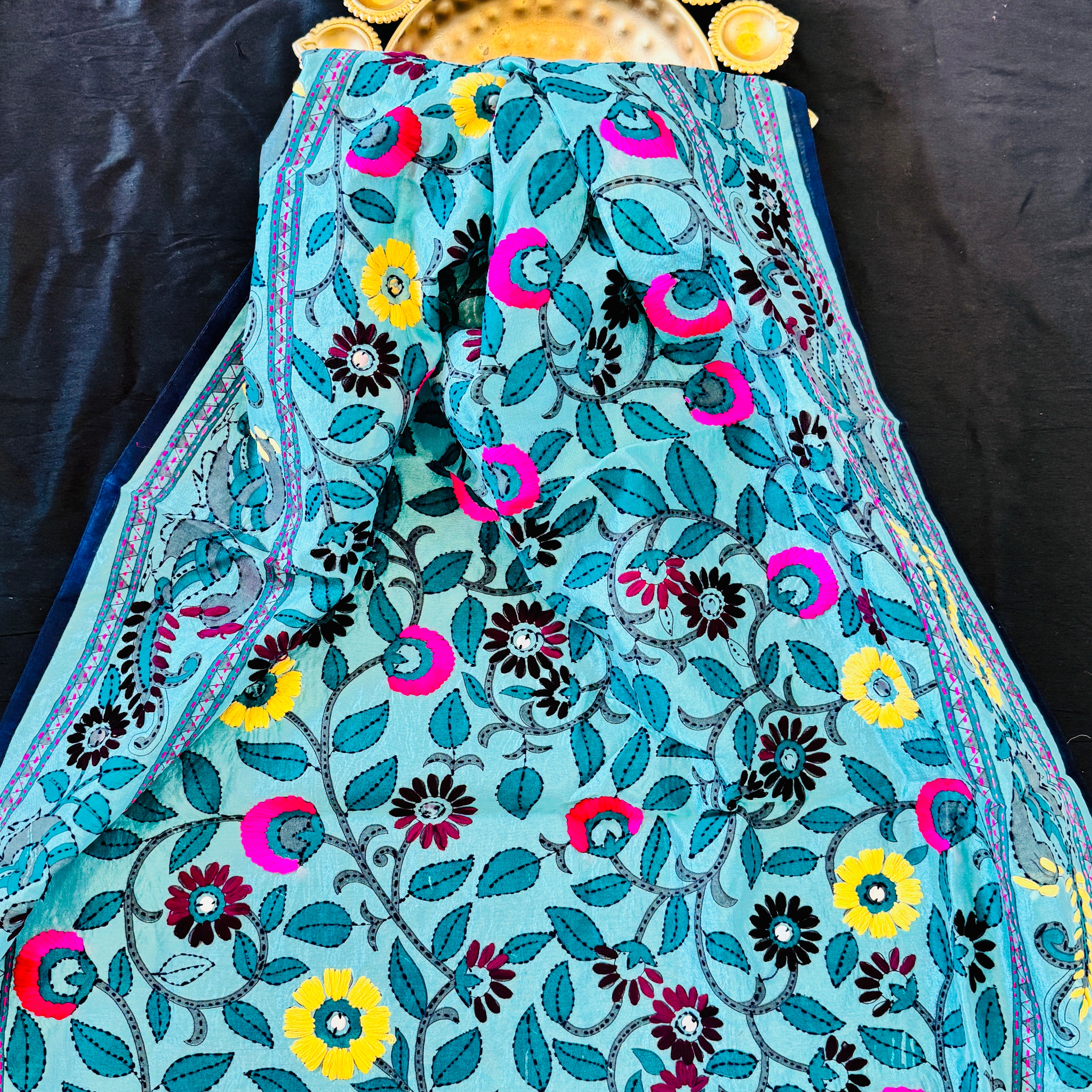Phulkari Hand-Embroidered & Hand Painted Dupatta- Blue
