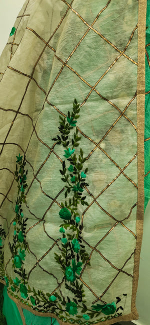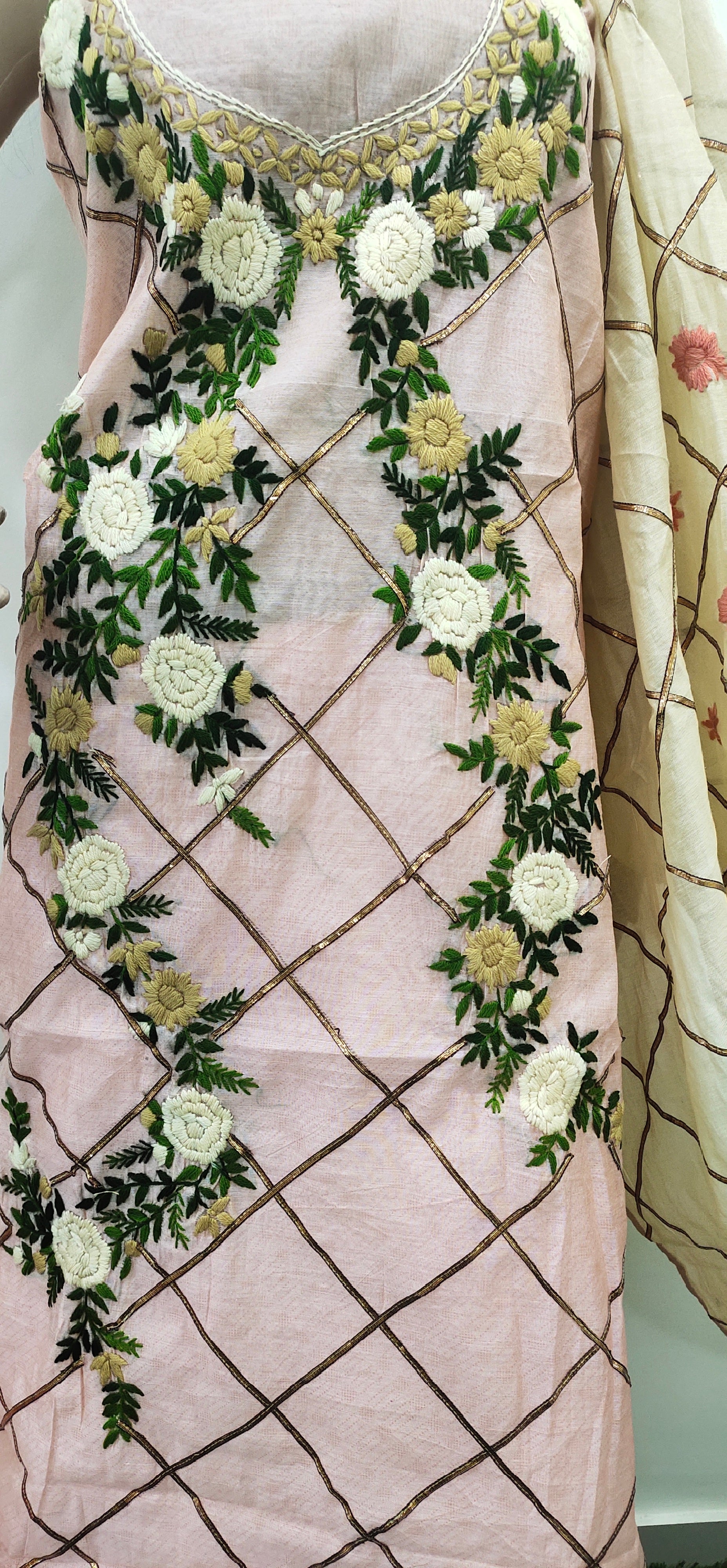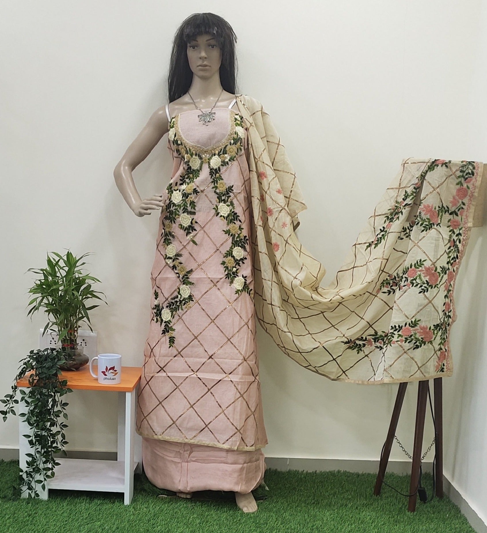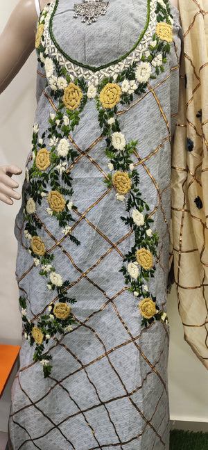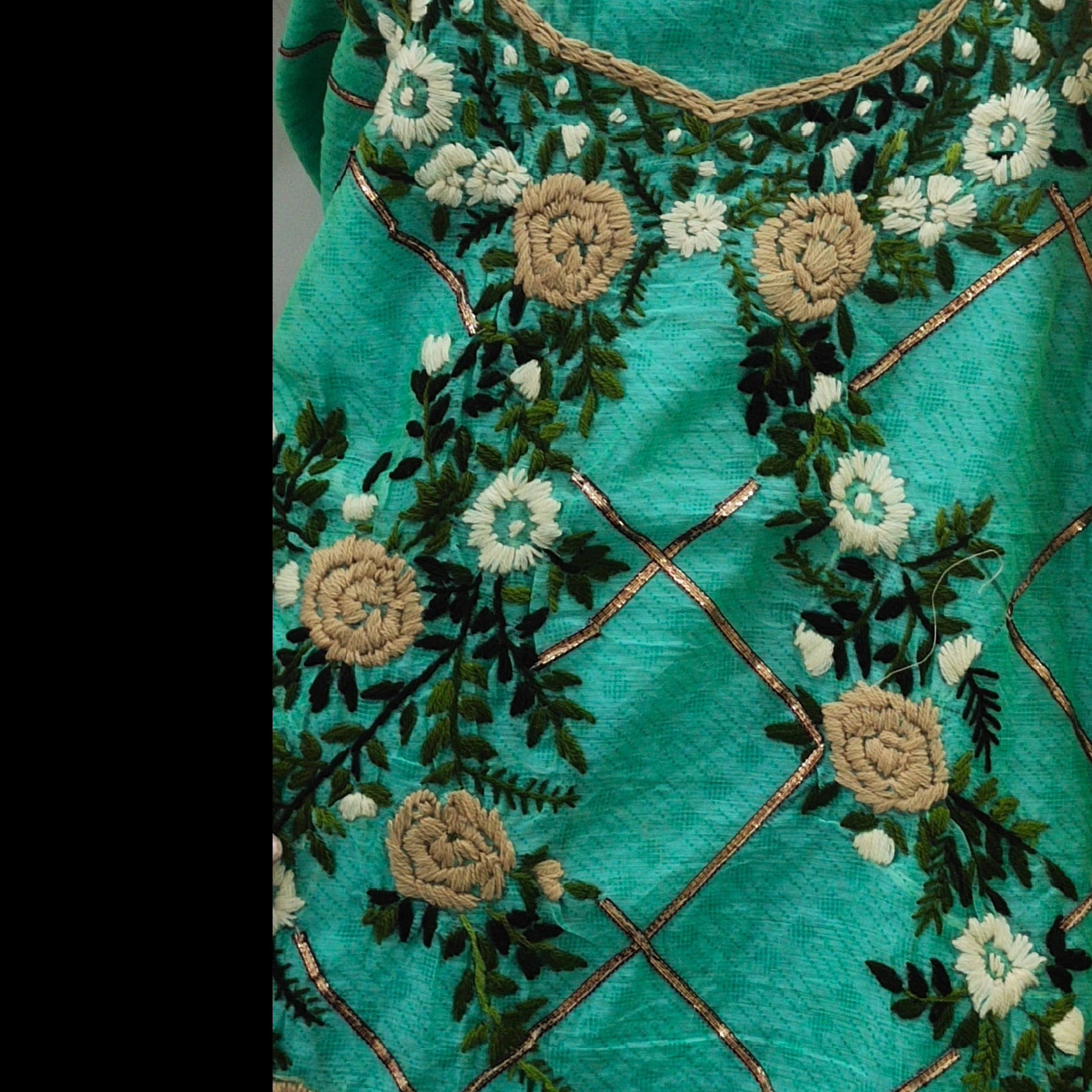 Hand-embroidered salwar suit fabric with gotapatti work, makes for a classy occasion wear. Accessorise this salwar suit with oxidised jewelry.