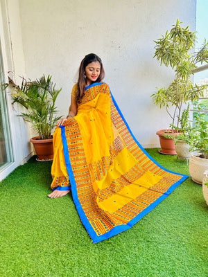 Bangladeshi Tant Saree Embroidery Foil Mirror Work - Yellow Blue