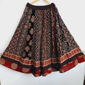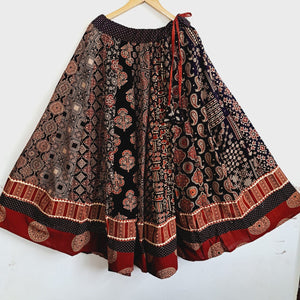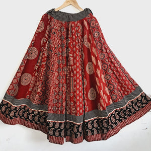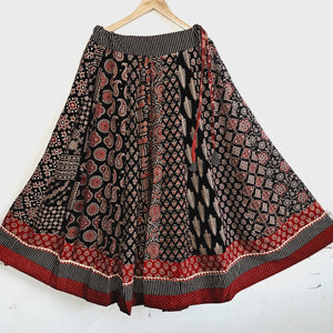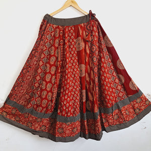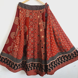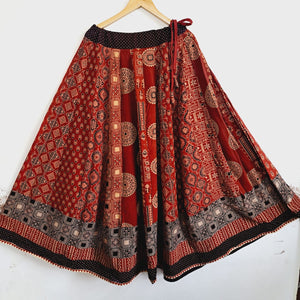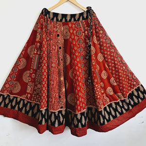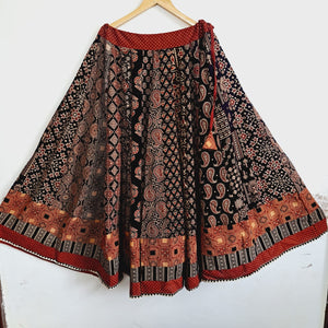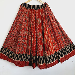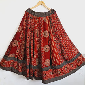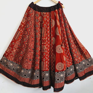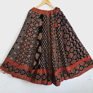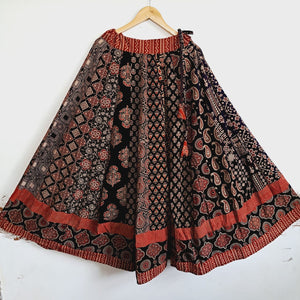This cotton Ajrakh skirt is a stellar for both casual and festive celebrations. The skirt can be teamed with either a long kurta, short kurta, shirt or even a top. To elevate your ethnic avatar add a pair of earrings and bangles.