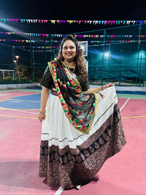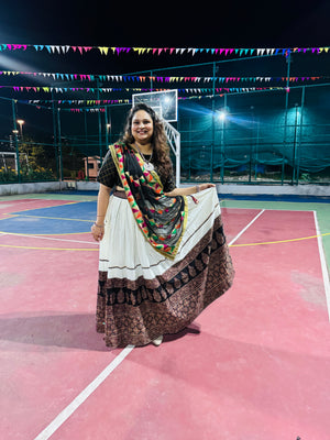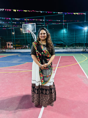 This cotton Ajrakh skirt is a stellar for both casual and festive celebrations. The skirt can be teamed with either a long kurta, short kurta, shirt or even a top. To elevate your ethnic avatar add a pair of earrings and bangles.